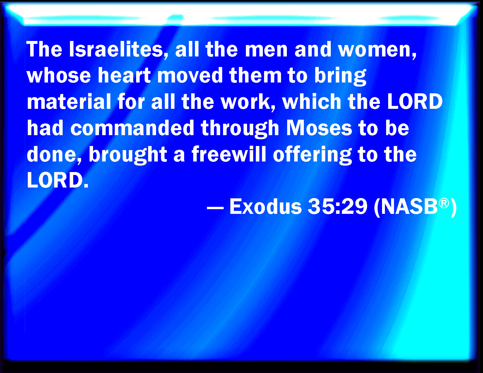 Bible Verse Slide Exodus 35:29 The children of Israel brought a willing offering to the LORD, every man and woman, whose heart made them willing to bring for all manner of work, which the LORD had commanded to be made by the hand of Moses. KJV: The children of Israel brought a willing offering unto the LORD, every man and woman, whose heart made them willing to bring for all manner of work, which the LORD had commanded to be made by the hand of Moses. DRB: All both men and women with devout mind offered gifts, that the works might be done which the Lord had commanded by the hand of Moses. All the children of Israel dedicated voluntary offerings to the Lord. DBT: The children of Israel brought a voluntary offering to Jehovah, every man and woman whose heart prompted them to bring for all manner of work, which Jehovah, by the hand of Moses, had commanded to be done. ERV: The children of Israel brought a freewill offering unto the LORD; every man and woman, whose heart made them willing to bring for all the work, which the LORD had commanded to be made by the hand of Moses. WBT: The children of Israel brought a willing offering to the LORD, every man and woman, whose heart made them willing to bring for all manner of work, which the LORD had commanded to be made by the hand of Moses. WEB: The children of Israel brought a freewill offering to Yahweh; every man and woman, whose heart made them willing to bring for all the work, which Yahweh had commanded to be made by Moses. YLT: every man and woman (whom their heart hath made willing to bring in for all the work which Jehovah commanded to be done by the hand of Moses) of the sons of Israel brought in a willing-offering to Jehovah.Links Exodus 35:29 NIV • Exodus 35:29 NLT • Exodus 35:29 ESV • Exodus 35:29 NASB • Exodus 35:29 KJV • Exodus 35:29 Interlinear • Exodus 35:29 Commentaries • Exodus 35:29 Parallel Texts • Exodus 35:29 Bible Apps • Exodus 35:29 Parallel • Bible Hub |