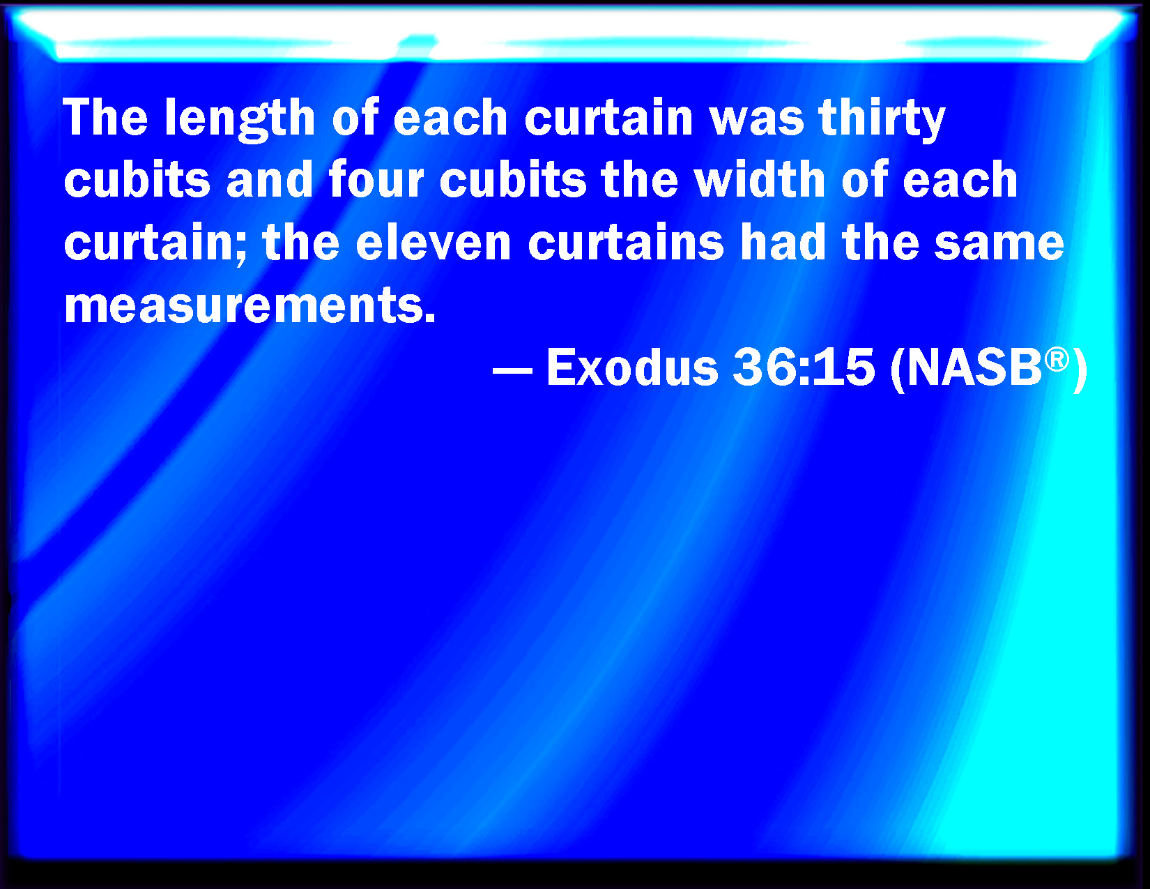Exodus 36:15 The length of one curtain was thirty cubits, and four cubits was the breadth of one curtain: the eleven curtains were of one size.