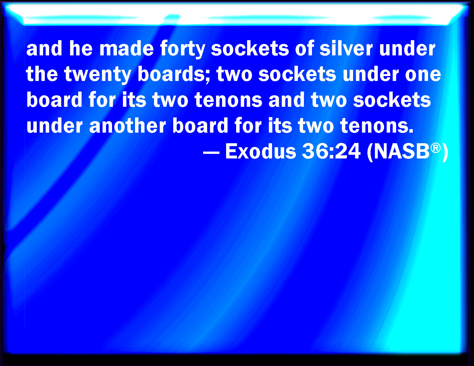 Bible Verse Slide Exodus 36:24 And forty sockets of silver he made under the twenty boards; two sockets under one board for his two tenons, and two sockets under another board for his two tenons. KJV: And forty sockets of silver he made under the twenty boards; two sockets under one board for his two tenons, and two sockets under another board for his two tenons. DRB: With forty sockets of silver, two sockets were put under one board on the two sides of the corners, where the mortises of the sides end in the corners. DBT: and he made forty bases of silver under the twenty boards, two bases under one board, for its two tenons, and two bases under another board for its two tenons. ERV: and he made forty sockets of silver under the twenty boards; two sockets under one board for its two tenons, and two sockets under another board for its two tenons. WBT: And forty sockets of silver he made under the twenty boards; two sockets under one board for its two tenons, and two sockets under another board for its two tenons. WEB: He made forty sockets of silver under the twenty boards; two sockets under one board for its two tenons, and two sockets under another board for its two tenons. YLT: and forty sockets of silver he hath made under the twenty boards, two sockets under the one board for its two handles, and two sockets under the other board for its two handles.Links Exodus 36:24 NIV • Exodus 36:24 NLT • Exodus 36:24 ESV • Exodus 36:24 NASB • Exodus 36:24 KJV • Exodus 36:24 Interlinear • Exodus 36:24 Commentaries • Exodus 36:24 Parallel Texts • Exodus 36:24 Bible Apps • Exodus 36:24 Parallel • Bible Hub |