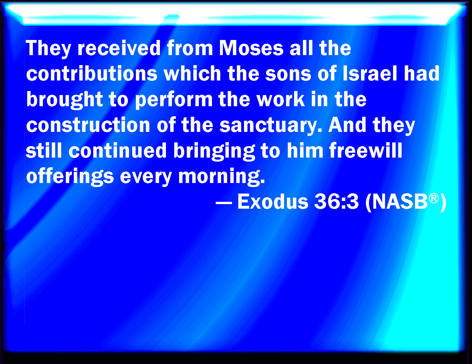 Bible Verse Slide Exodus 36:3 And they received of Moses all the offering, which the children of Israel had brought for the work of the service of the sanctuary, to make it with. And they brought yet to him free offerings every morning. KJV: And they received of Moses all the offering, which the children of Israel had brought for the work of the service of the sanctuary, to make it withal. And they brought yet unto him free offerings every morning. DRB: He delivered all the offerings of the children of Israel unto them. And while they were earnest about the work, the people daily in the morning offered their vows. DBT: And they took from Moses every heave-offering that the children of Israel had brought for the work of the service of the sanctuary, to make it. And they still brought him voluntary offerings morning by morning. ERV: and they received of Moses all the offering, which the children of Israel had brought for the work of the service of the sanctuary, to make it withal. And they brought yet unto him freewill offerings every morning. WBT: And they received from Moses all the offering which the children of Israel had brought for the work of the service of the sanctuary, to make it. And they brought yet to him free-offerings every morning. WEB: and they received from Moses all the offering which the children of Israel had brought for the work of the service of the sanctuary, with which to make it. They brought yet to him freewill offerings every morning. YLT: And they take from before Moses all the heave-offering which the sons of Israel have brought in for the work of the service of the sanctuary to do it; and still they have brought in unto him a willing-offering morning by morning.Links Exodus 36:3 NIV • Exodus 36:3 NLT • Exodus 36:3 ESV • Exodus 36:3 NASB • Exodus 36:3 KJV • Exodus 36:3 Interlinear • Exodus 36:3 Commentaries • Exodus 36:3 Parallel Texts • Exodus 36:3 Bible Apps • Exodus 36:3 Parallel • Bible Hub |