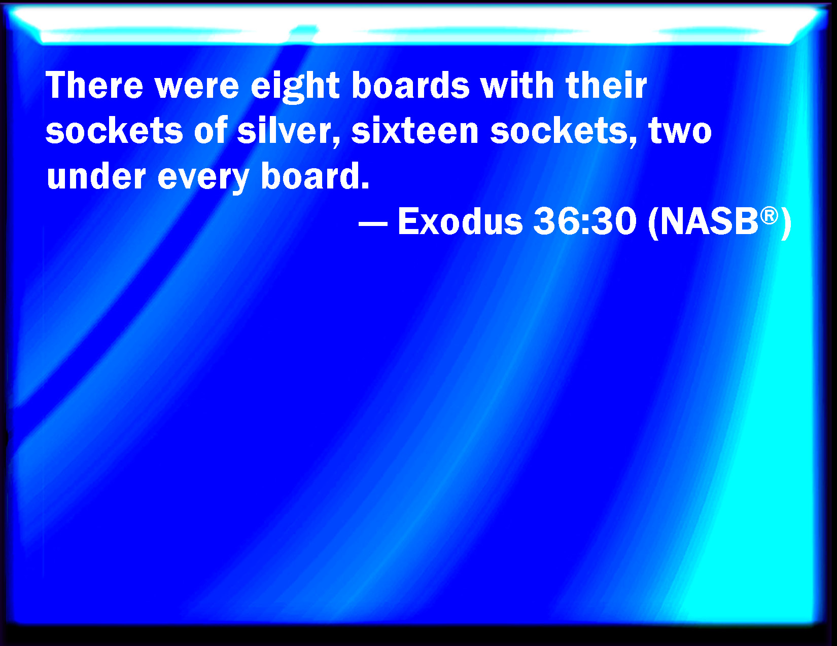Bible Verse Slide Exodus 36:30 And there were eight boards; and their sockets were sixteen sockets of silver, under every board two sockets. KJV: And there were eight boards; and their sockets were sixteen sockets of silver, under every board two sockets. DRB: So there were in all eight boards and they had sixteen sockets of silver, to wit, two sockets under every board. DBT: and there were eight boards, and their silver bases: sixteen bases, under every board two bases. ERV: And there were eight boards, and their sockets of silver, sixteen sockets; under every board two sockets. WBT: And there were eight boards; and their sockets were sixteen sockets of silver, under every board two sockets. WEB: There were eight boards, and their sockets of silver, sixteen sockets; under every board two sockets. YLT: and there have been eight boards; and their sockets of silver are sixteen sockets, two sockets under the one board.Links Exodus 36:30 NIV • Exodus 36:30 NLT • Exodus 36:30 ESV • Exodus 36:30 NASB • Exodus 36:30 KJV • Exodus 36:30 Interlinear • Exodus 36:30 Commentaries • Exodus 36:30 Parallel Texts • Exodus 36:30 Bible Apps • Exodus 36:30 Parallel • Bible Hub |