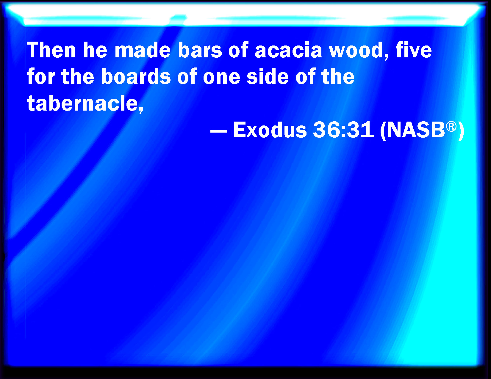 Bible Verse Slide Exodus 36:31 And he made bars of shittim wood; five for the boards of the one side of the tabernacle, KJV: And he made bars of shittim wood; five for the boards of the one side of the tabernacle, DRB: He made also bars of setim wood, five to hold together the boards of one side of the tabernacle, DBT: And he made bars of acacia-wood: five for the boards of the one side of the tabernacle, ERV: And he made bars of acacia wood; five for the boards of the one side of the tabernacle, WBT: And he made bars of shittim wood; five for the boards of the one side of the tabernacle, WEB: He made bars of acacia wood; five for the boards of the one side of the tabernacle, YLT: And he maketh bars of shittim wood, five for the boards of the one side of the tabernacle,Links Exodus 36:31 NIV • Exodus 36:31 NLT • Exodus 36:31 ESV • Exodus 36:31 NASB • Exodus 36:31 KJV • Exodus 36:31 Interlinear • Exodus 36:31 Commentaries • Exodus 36:31 Parallel Texts • Exodus 36:31 Bible Apps • Exodus 36:31 Parallel • Bible Hub |