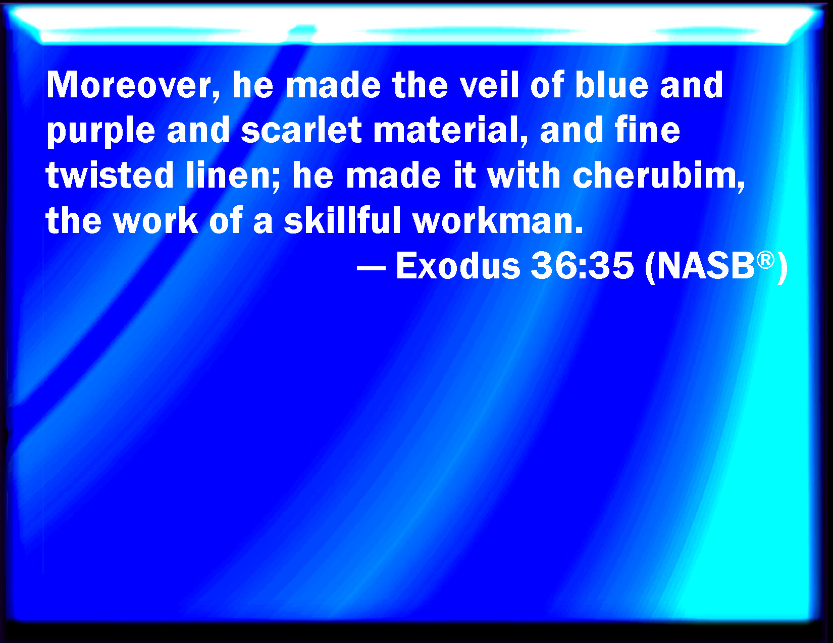 Bible Verse Slide Exodus 36:35 And he made a veil of blue, and purple, and scarlet, and fine twined linen: with cherubim made he it of cunning work. KJV: And he made a vail of blue, and purple, and scarlet, and fine twined linen: with cherubims made he it of cunning work. DRB: He made also a veil of violet, and purple, scarlet, and fine twisted linen, varied and distinguished with embroidery: DBT: And he made the veil of blue, and purple, and scarlet, and twined byssus: of artistic work he made it with cherubim. ERV: And he made the veil of blue, and purple, and scarlet, and fine twined linen: with cherubim the work of the cunning workman made he it. WBT: And he made a vail of blue, and purple, and scarlet, and fine twined linen: with cherubim he made it of curious work. WEB: He made the veil of blue, purple, scarlet, and fine twined linen: with cherubim. He made it the work of a skillful workman. YLT: And he maketh the vail of blue, and purple, and scarlet, and twined linen, work of a designer he hath made it, with cherubs;Links Exodus 36:35 NIV • Exodus 36:35 NLT • Exodus 36:35 ESV • Exodus 36:35 NASB • Exodus 36:35 KJV • Exodus 36:35 Interlinear • Exodus 36:35 Commentaries • Exodus 36:35 Parallel Texts • Exodus 36:35 Bible Apps • Exodus 36:35 Parallel • Bible Hub |