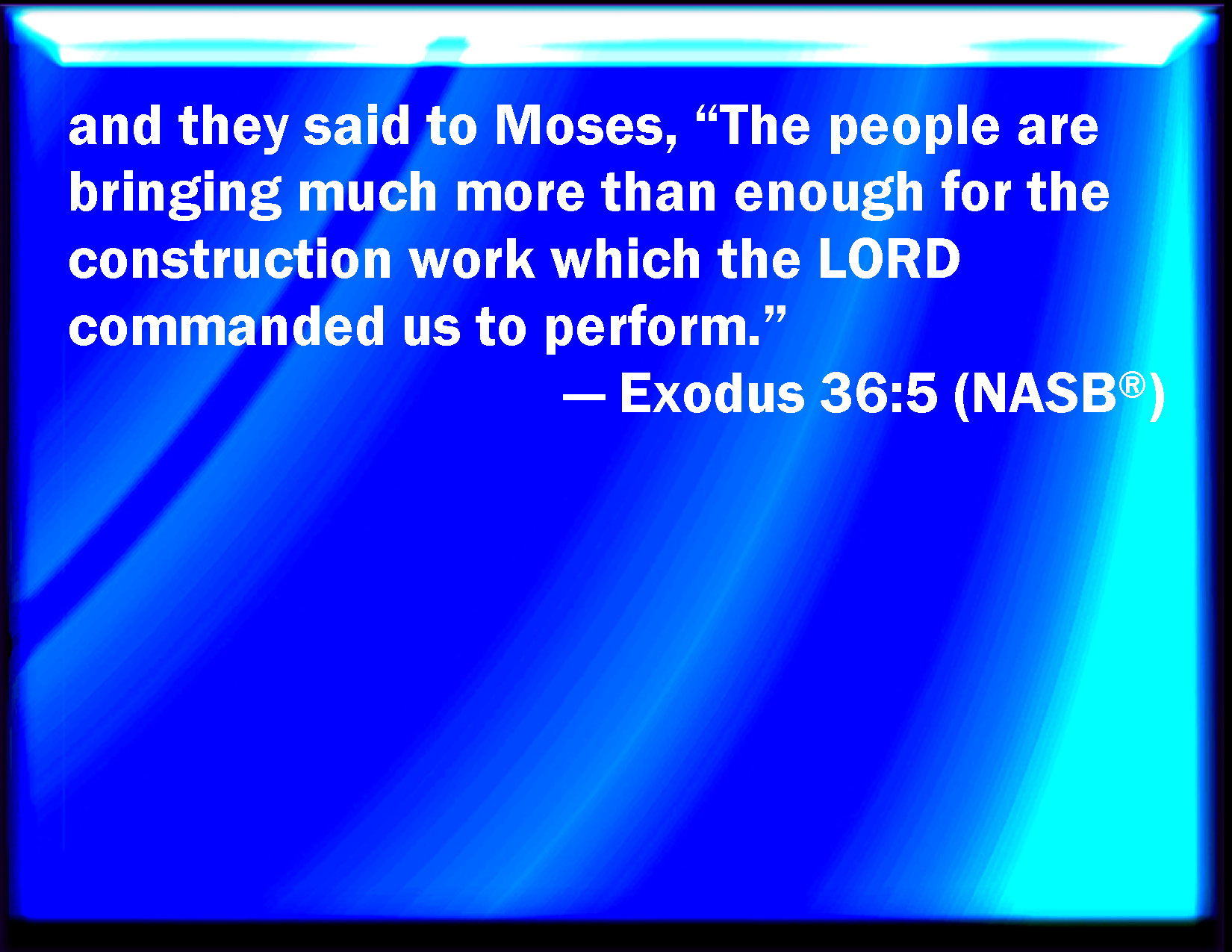 Bible Verse Slide Exodus 36:5 And they spoke to Moses, saying, The people bring much more than enough for the service of the work, which the LORD commanded to make. KJV: And they spake unto Moses, saying, The people bring much more than enough for the service of the work, which the LORD commanded to make. DRB: Said to Moses: The people offereth more than is necessary. DBT: and spoke to Moses, saying, The people bring much more than enough for the service of the work that Jehovah commanded to be done. ERV: and they spake unto Moses, saying, The people bring much more than enough for the service of the work, which the LORD commanded to make. WBT: And they spoke to Moses, saying, The people bring much more than enough for the service of the work, which the LORD commanded to make. WEB: They spoke to Moses, saying, "The people bring much more than enough for the service of the work which Yahweh commanded to make." YLT: and speak unto Moses, saying, 'The people are multiplying to bring in more than sufficient for the service of the work which Jehovah commanded to make.'Links Exodus 36:5 NIV • Exodus 36:5 NLT • Exodus 36:5 ESV • Exodus 36:5 NASB • Exodus 36:5 KJV • Exodus 36:5 Interlinear • Exodus 36:5 Commentaries • Exodus 36:5 Parallel Texts • Exodus 36:5 Bible Apps • Exodus 36:5 Parallel • Bible Hub |