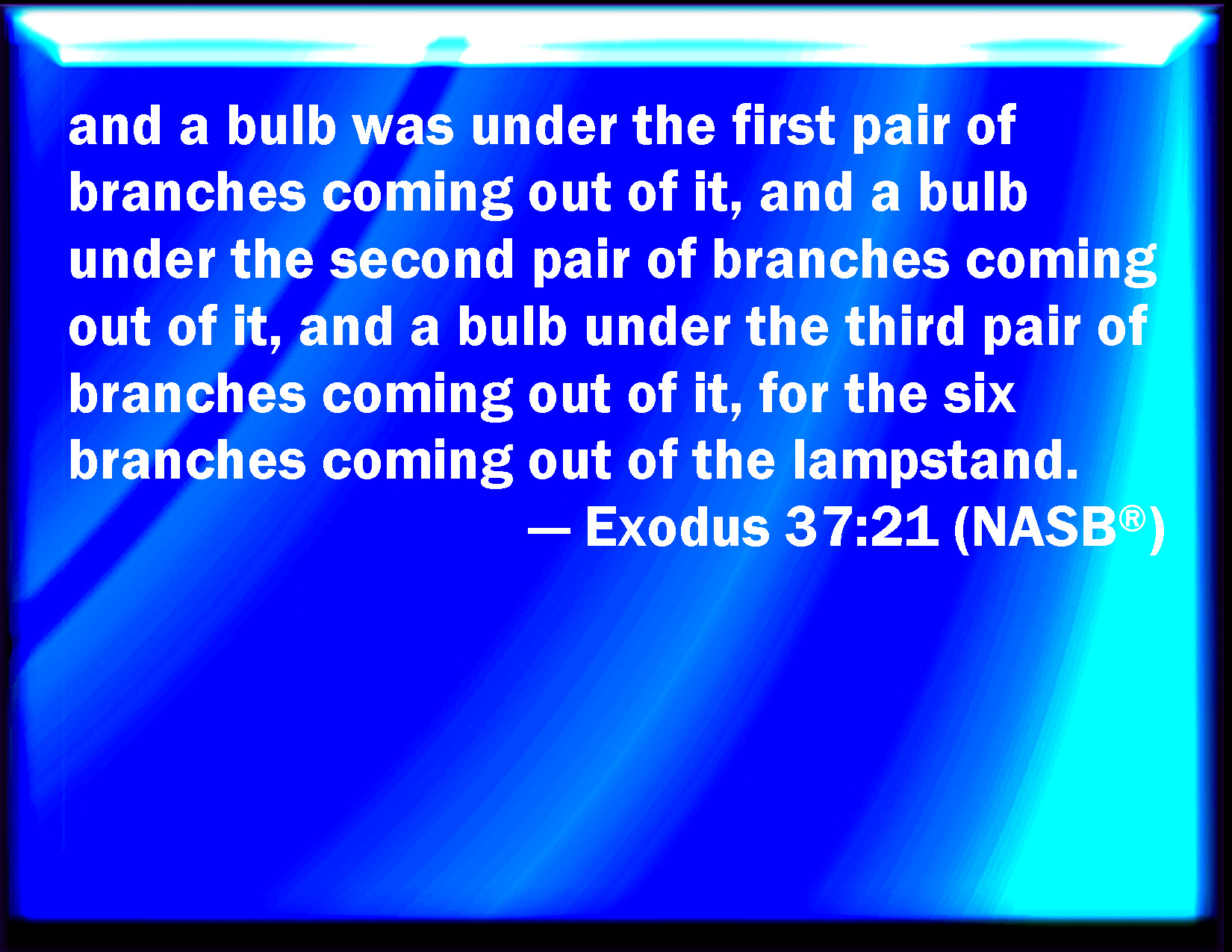 Bible Verse Slide Exodus 37:21 And a bud under two branches of the same, and a bud under two branches of the same, and a bud under two branches of the same, according to the six branches going out of it. KJV: And a knop under two branches of the same, and a knop under two branches of the same, and a knop under two branches of the same, according to the six branches going out of it. DRB: And bowls under two branches in three places, which together make six branches going out from one shaft. DBT: and a knob under two branches thereof, and again a knob under two branches thereof, and again a knob under two branches thereof, for the six branches which went out of it. ERV: and a knop under two branches of one piece with it, and a knop under two branches of one piece with it, and a knop under two branches of one piece with it, for the six branches going out of it. WBT: And a knob under two branches of the same, and a knob under two branches of the same, and a knob under two branches of the same, according to the six branches proceeding from it. WEB: and a bud under two branches of one piece with it, and a bud under two branches of one piece with it, and a bud under two branches of one piece with it, for the six branches going out of it. YLT: and a knop under the two branches of the same, and a knop under the two branches of the same, and a knop under the two branches of the same, are to the six branches which are coming out of it;Links Exodus 37:21 NIV • Exodus 37:21 NLT • Exodus 37:21 ESV • Exodus 37:21 NASB • Exodus 37:21 KJV • Exodus 37:21 Interlinear • Exodus 37:21 Commentaries • Exodus 37:21 Parallel Texts • Exodus 37:21 Bible Apps • Exodus 37:21 Parallel • Bible Hub |