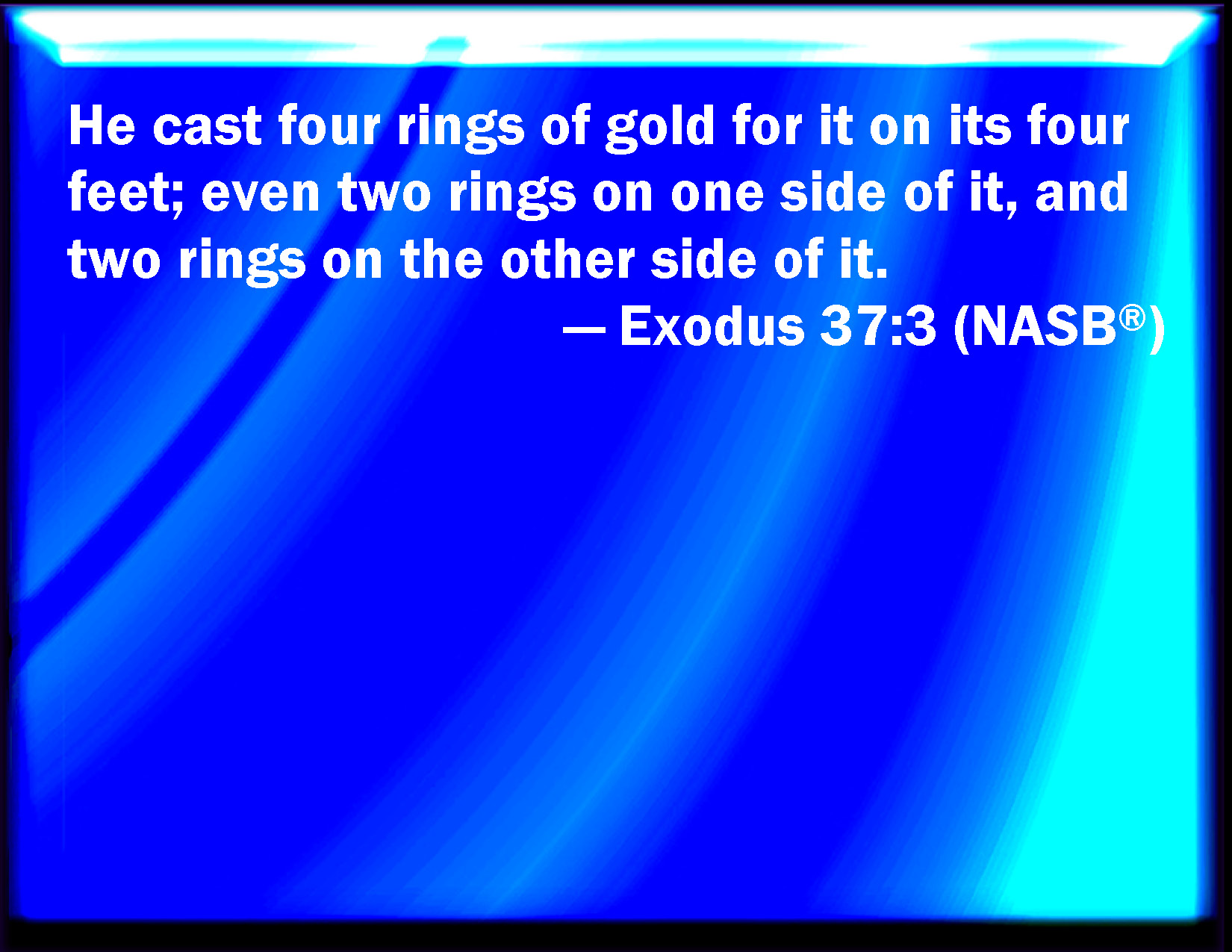 Bible Verse Slide Exodus 37:3 And he cast for it four rings of gold, to be set by the four corners of it; even two rings on the one side of it, and two rings on the other side of it. KJV: And he cast for it four rings of gold, to be set by the four corners of it; even two rings upon the one side of it, and two rings upon the other side of it. DRB: Casting four rings of gold at the four corners thereof: two rings in one side, and two in the other. DBT: And he cast for it four rings of gold, for its four corners: two rings on the one side of it, and two rings on the other side of it. ERV: And he cast for it four rings of gold, in the four feet thereof; even two rings on the one side of it, and two rings on the other side of it. WBT: And he cast for it four rings of gold, to be set by the four corners of it; even two rings upon the one side of it, and two rings upon the other side of it. WEB: He cast four rings of gold for it, in its four feet; even two rings on its one side, and two rings on its other side. YLT: and he casteth for it four rings of gold, on its four feet, even two rings on its one side, and two rings on its second side;Links Exodus 37:3 NIV • Exodus 37:3 NLT • Exodus 37:3 ESV • Exodus 37:3 NASB • Exodus 37:3 KJV • Exodus 37:3 Interlinear • Exodus 37:3 Commentaries • Exodus 37:3 Parallel Texts • Exodus 37:3 Bible Apps • Exodus 37:3 Parallel • Bible Hub |