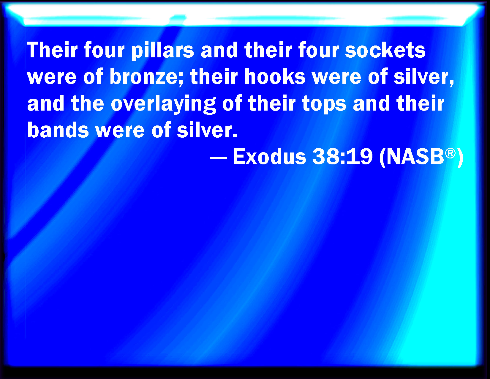 Bible Verse Slide Exodus 38:19 And their pillars were four, and their sockets of brass four; their hooks of silver, and the overlaying of their capitals and their fillets of silver. KJV: And their pillars were four, and their sockets of brass four; their hooks of silver, and the overlaying of their chapiters and their fillets of silver. DRB: And the pillars in the entry were four with sockets of brass, and their heads and gravings of silver. DBT: and their pillars four, and their bases four, of copper; their hooks of silver, and the overlaying of their capitals and their connecting-rods of silver. ERV: And their pillars were four, and their sockets four, of brass; their hooks of silver, and the overlaying of their chapiters and their fillets of silver. WBT: And their pillars were four, and their sockets of brass four; their hooks of silver, and the overlaying of their capitals and their fillets of silver. WEB: Their pillars were four, and their sockets four, of brass; their hooks of silver, and the overlaying of their capitals, and their fillets, of silver. YLT: and their pillars are four, and their sockets of brass four, their pegs are of silver, and the overlaying of their tops and their fillets are of silver;Links Exodus 38:19 NIV • Exodus 38:19 NLT • Exodus 38:19 ESV • Exodus 38:19 NASB • Exodus 38:19 KJV • Exodus 38:19 Interlinear • Exodus 38:19 Commentaries • Exodus 38:19 Parallel Texts • Exodus 38:19 Bible Apps • Exodus 38:19 Parallel • Bible Hub |