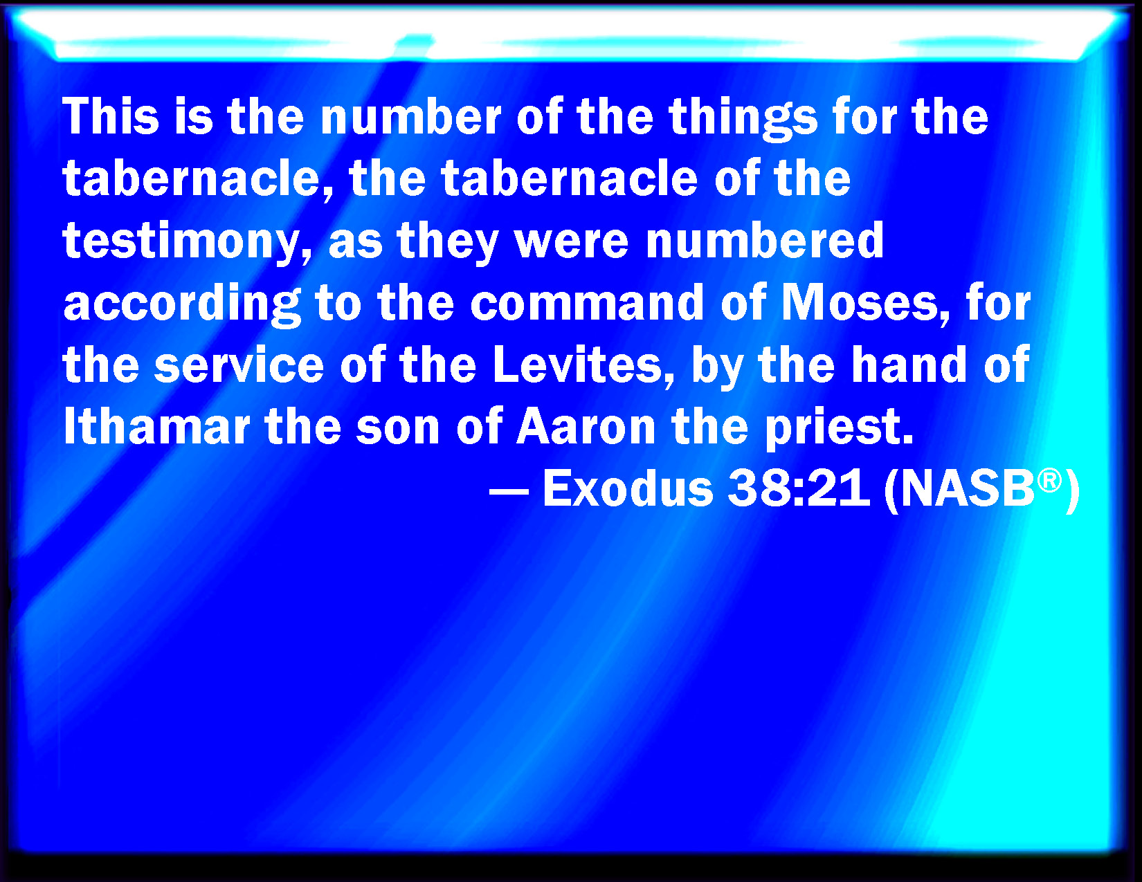 Bible Verse Slide Exodus 38:21 This is the sum of the tabernacle, even of the tabernacle of testimony, as it was counted, according to the commandment of Moses, for the service of the Levites, by the hand of Ithamar, son to Aaron the priest. KJV: This is the sum of the tabernacle, even of the tabernacle of testimony, as it was counted, according to the commandment of Moses, for the service of the Levites, by the hand of Ithamar, son to Aaron the priest. DRB: These are the instruments of the tabernacle of the testimony, which were counted according to the commandment of Moses, in the ceremonies of the Levites, by the hand of Ithamar son of Aaron the priest: DBT: These are the things numbered of the tabernacle, the tabernacle of the testimony, which were counted, according to the commandment of Moses, by the service of the Levites, under the hand of Ithamar, son of Aaron the priest. ERV: This is the sum of the things for the tabernacle, even the tabernacle of the testimony, as they were counted, according to the commandment of Moses, for the service of the Levites, by the hand of Ithamar, the son of Aaron the priest. WBT: This is the sum of the tabernacle, even of the tabernacle of testimony, as it was counted, according to the commandment of Moses, for the service of the Levites, by the hand of Ithamar, son to Aaron the priest. WEB: This is the amount of material used for the tabernacle, even the Tabernacle of the Testimony, as they were counted, according to the commandment of Moses, for the service of the Levites, by the hand of Ithamar, the son of Aaron the priest. YLT: These are the numberings of the tabernacle (the tabernacle of testimony), which hath been numbered by the command of Moses, the service of the Levites, by the hand of Ithamar son of Aaron the priest.Links Exodus 38:21 NIV • Exodus 38:21 NLT • Exodus 38:21 ESV • Exodus 38:21 NASB • Exodus 38:21 KJV • Exodus 38:21 Interlinear • Exodus 38:21 Commentaries • Exodus 38:21 Parallel Texts • Exodus 38:21 Bible Apps • Exodus 38:21 Parallel • Bible Hub |