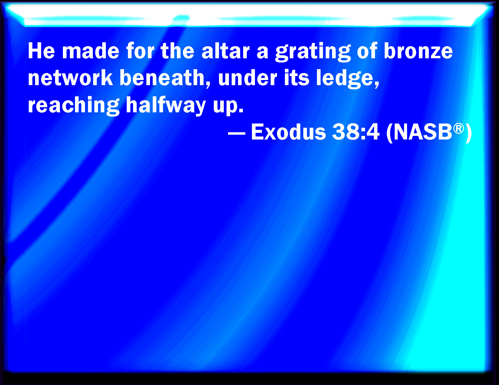 Bible Verse Slide Exodus 38:4 And he made for the altar a brazen grate of network under the compass thereof beneath to the middle of it. KJV: And he made for the altar a brasen grate of network under the compass thereof beneath unto the midst of it. DRB: And he made the grate thereof of brass, in manner of a net, and under it in the midst of the altar a hearth, DBT: And he made for the altar a grating of network of copper under its ledge from beneath, to the very middle of it. ERV: And he made for the altar a grating of network of brass, under the ledge round it beneath, reaching halfway up. WBT: And he made for the altar a brazen grate of net-work under the compass of it beneath to the midst of it. WEB: He made for the altar a grating of a network of brass, under the ledge around it beneath, reaching halfway up. YLT: And he maketh for the altar a brazen grate of net-work, under its border beneath, unto its midst;Links Exodus 38:4 NIV • Exodus 38:4 NLT • Exodus 38:4 ESV • Exodus 38:4 NASB • Exodus 38:4 KJV • Exodus 38:4 Interlinear • Exodus 38:4 Commentaries • Exodus 38:4 Parallel Texts • Exodus 38:4 Bible Apps • Exodus 38:4 Parallel • Bible Hub |