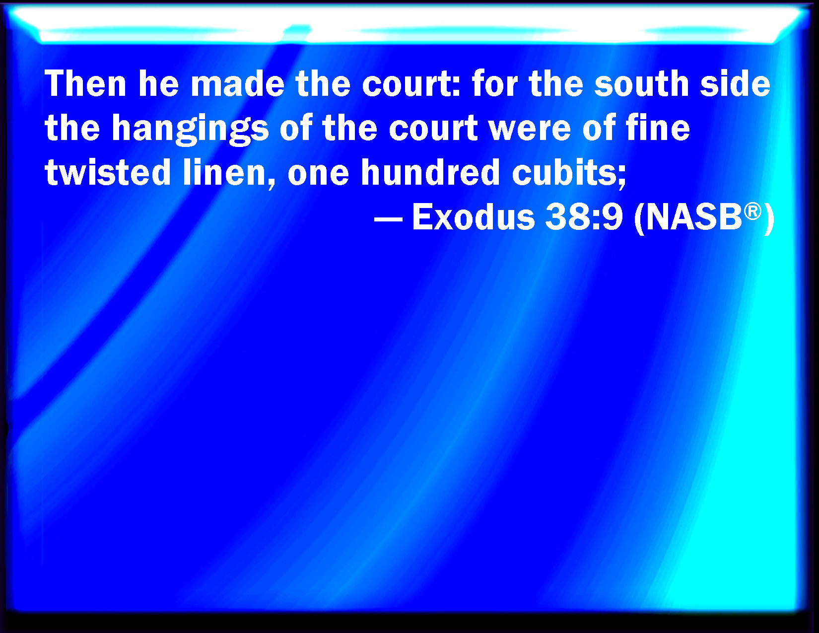 Bible Verse Slide Exodus 38:9 And he made the court: on the south side southward the hangings of the court were of fine twined linen, an hundred cubits: KJV: And he made the court: on the south side southward the hangings of the court were of fine twined linen, an hundred cubits: DRB: He made also the court, in the south side whereof were hangings of fine twisted linen, of a hundred cubits, DBT: And he made the court. On the south side southward, the hangings of the court were of twined byssus, a hundred cubits; ERV: And he made the court: for the south side southward the hangings of the court were of fine twined linen, an hundred cubits: WBT: And he made the court: on the south side southward the hangings of the court were of fine twined linen, a hundred cubits: WEB: He made the court: for the south side southward the hangings of the court were of fine twined linen, one hundred cubits; YLT: And he maketh the court; at the south side southward, the hangings of the court of twined linen, a hundred by the cubit,Links Exodus 38:9 NIV • Exodus 38:9 NLT • Exodus 38:9 ESV • Exodus 38:9 NASB • Exodus 38:9 KJV • Exodus 38:9 Interlinear • Exodus 38:9 Commentaries • Exodus 38:9 Parallel Texts • Exodus 38:9 Bible Apps • Exodus 38:9 Parallel • Bible Hub |