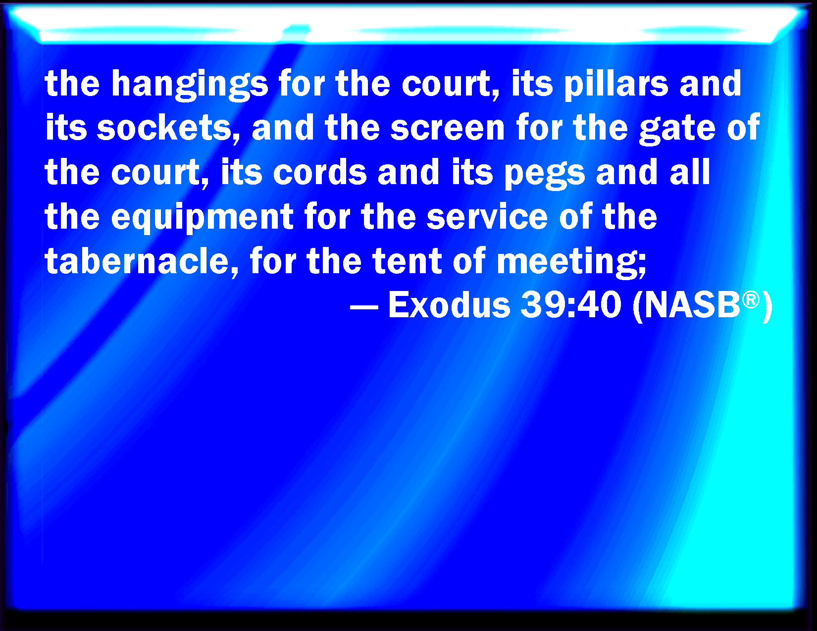 Bible Verse Slide Exodus 39:40 The hangings of the court, his pillars, and his sockets, and the hanging for the court gate, his cords, and his pins, and all the vessels of the service of the tabernacle, for the tent of the congregation, KJV: The hangings of the court, his pillars, and his sockets, and the hanging for the court gate, his cords, and his pins, and all the vessels of the service of the tabernacle, for the tent of the congregation, DRB: The hanging in the entry of the court, and the little cords, and the pins thereof. Nothing was wanting of the vessels, that were commanded to be made for the ministry of the tabernacle, and for the roof of the covenant. DBT: the hangings of the court, its pillars, and its bases; and the curtain for the gate of the court, its cords, and its pegs; and all the vessel's of service of the tabernacle, for the tent of meeting; ERV: the hangings of the court, its pillars, and its sockets, and the screen for the gate of the court, the cords thereof, and the pins thereof, and all the instruments of the service of the tabernacle, for the tent of meeting; WBT: The hangings of the court, its pillars, and its sockets, and the hanging for the court-gate, its cords, and its pins, and all the vessels of the service of the tabernacle, for the tent of the congregation, WEB: the hangings of the court, its pillars, its sockets, the screen for the gate of the court, its cords, its pins, all the instruments of the service of the tabernacle, for the Tent of Meeting, YLT: The hangings of the court, its pillars, and its sockets; and the covering for the gate of the court, its cords, and its pins; and all the vessels of the service of the tabernacle, for the tent of meeting;Links Exodus 39:40 NIV • Exodus 39:40 NLT • Exodus 39:40 ESV • Exodus 39:40 NASB • Exodus 39:40 KJV • Exodus 39:40 Interlinear • Exodus 39:40 Commentaries • Exodus 39:40 Parallel Texts • Exodus 39:40 Bible Apps • Exodus 39:40 Parallel • Bible Hub |