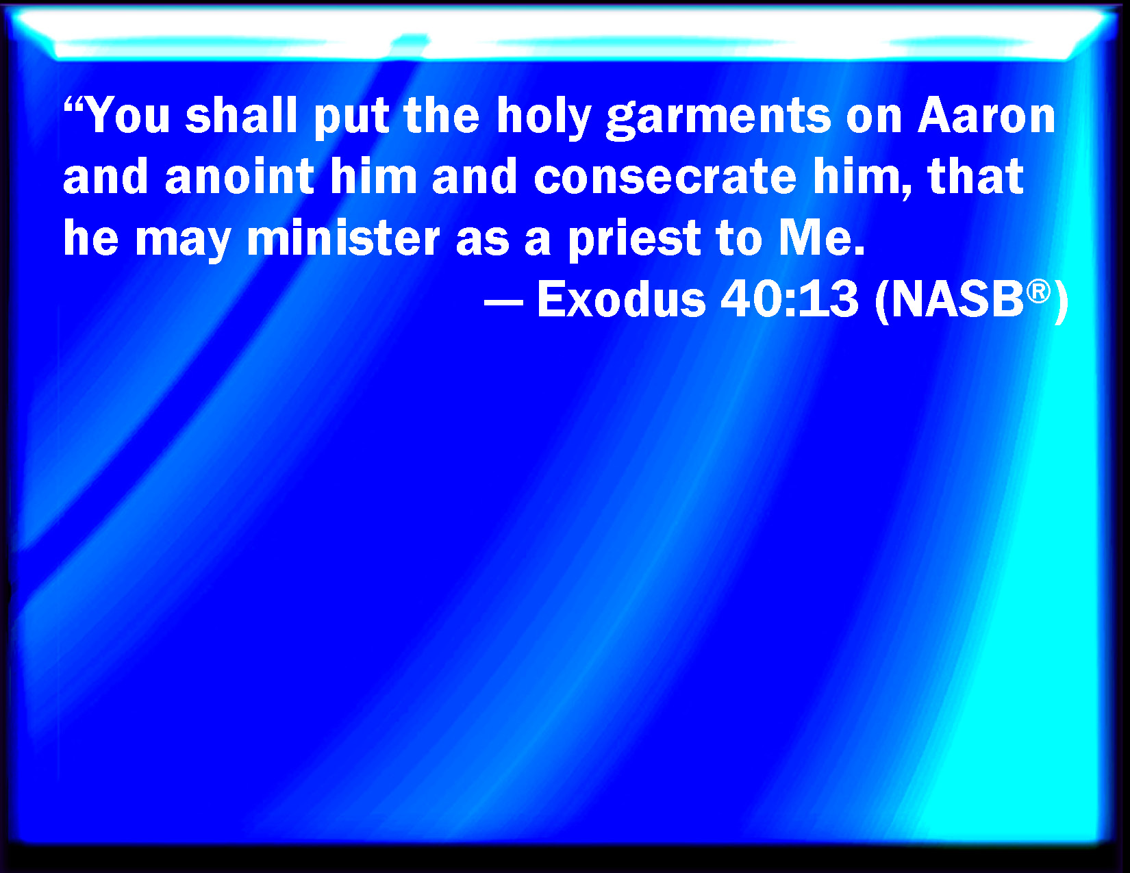 Bible Verse Slide Exodus 40:13 And you shall put on Aaron the holy garments, and anoint him, and sanctify him; that he may minister to me in the priest's office. KJV: And thou shalt put upon Aaron the holy garments, and anoint him, and sanctify him; that he may minister unto me in the priest's office. DRB: Thou shalt put on them the holy vestments, that they may minister to me, and that the unction of them may prosper to an everlasting priesthood. DBT: And thou shalt clothe Aaron with the holy garments, and anoint him, and hallow him, that he may serve me as priest. ERV: And thou shalt put upon Aaron the holy garments; and thou shalt anoint him, and sanctify him, that he may minister unto me in the priest's office. WBT: And thou shalt put upon Aaron the holy garments, and anoint him, and sanctify him; that he may minister to me in the priest's office. WEB: You shall put on Aaron the holy garments; and you shall anoint him, and sanctify him, that he may minister to me in the priest's office. YLT: and thou hast clothed Aaron with the holy garments, and anointed him, and sanctified him, and he hath acted as priest to Me.Links Exodus 40:13 NIV • Exodus 40:13 NLT • Exodus 40:13 ESV • Exodus 40:13 NASB • Exodus 40:13 KJV • Exodus 40:13 Interlinear • Exodus 40:13 Commentaries • Exodus 40:13 Parallel Texts • Exodus 40:13 Bible Apps • Exodus 40:13 Parallel • Bible Hub |