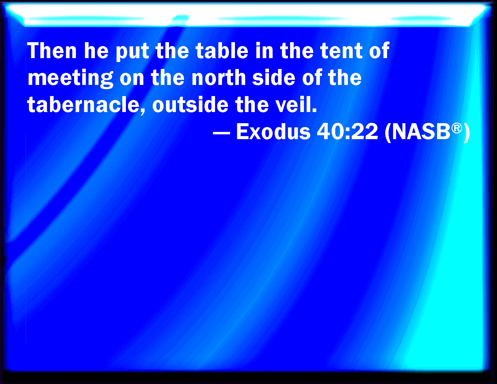 Bible Verse Slide Exodus 40:22 And he put the table in the tent of the congregation, on the side of the tabernacle northward, without the veil. KJV: And he put the table in the tent of the congregation, upon the side of the tabernacle northward, without the vail. DRB: And he set the table in the tabernacle of the testimony at the north side without the veil, DBT: And he put the table in the tent of meeting, on the side of the tabernacle northward, outside the veil, ERV: And he put the table in the tent of meeting, upon the side of the tabernacle northward, without the veil. WBT: And he put the table in the tent of the congregation, upon the side of the tabernacle northward, without the vail. WEB: He put the table in the Tent of Meeting, on the side of the tabernacle northward, outside of the veil. YLT: And he putteth the table in the tent of meeting, on the side of the tabernacle northward, at the outside of the vail,Links Exodus 40:22 NIV • Exodus 40:22 NLT • Exodus 40:22 ESV • Exodus 40:22 NASB • Exodus 40:22 KJV • Exodus 40:22 Interlinear • Exodus 40:22 Commentaries • Exodus 40:22 Parallel Texts • Exodus 40:22 Bible Apps • Exodus 40:22 Parallel • Bible Hub |