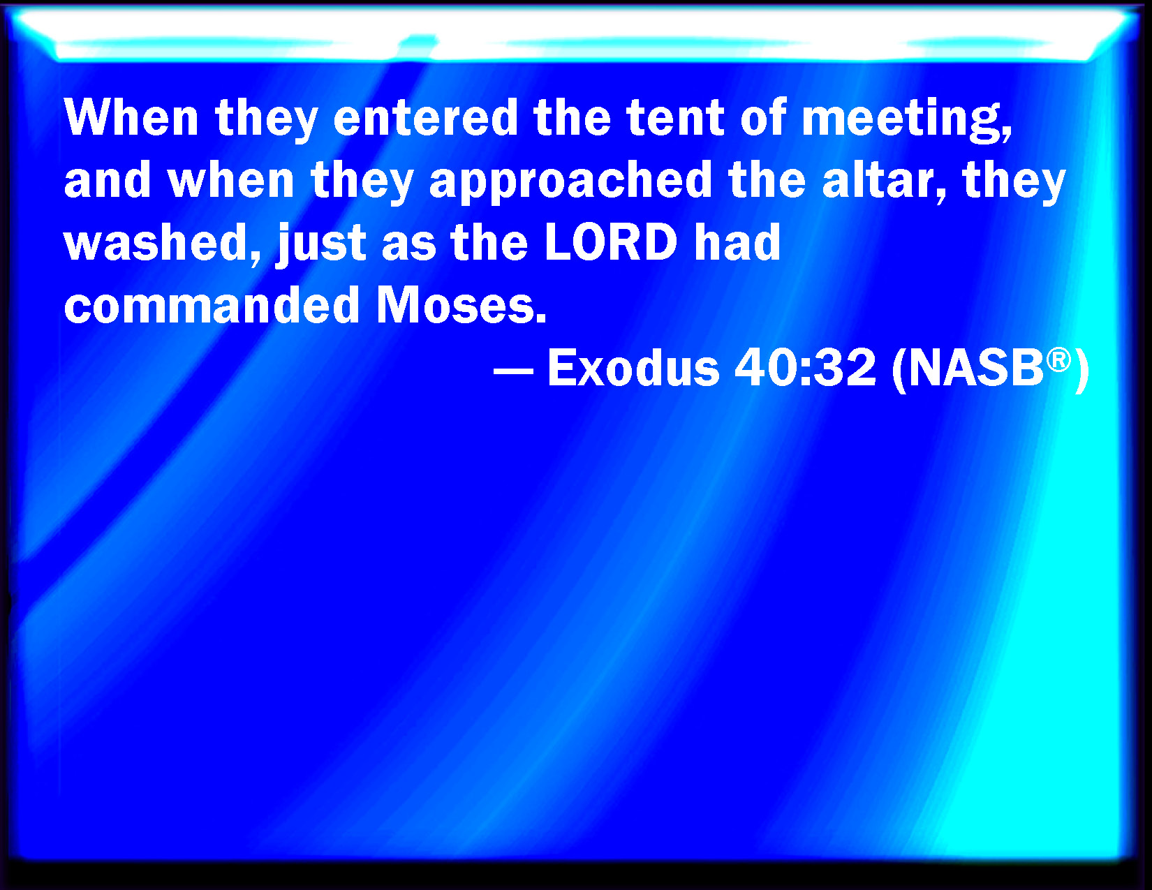 Bible Verse Slide Exodus 40:32 When they went into the tent of the congregation, and when they came near to the altar, they washed; as the LORD commanded Moses. KJV: When they went into the tent of the congregation, and when they came near unto the altar, they washed; as the LORD commanded Moses. DRB: When they went into the tabernacle of the covenant, and went to the altar, as the Lord had commanded Moses. DBT: when they went into the tent of meeting, and when they drew near to the altar, they washed; as Jehovah had commanded Moses. ERV: when they went into the tent of meeting, and when they came near unto the altar, they washed: as the LORD commanded Moses. WBT: When they went into the tent of the congregation, and when they came near to the altar, they washed; as the LORD commanded Moses. WEB: When they went into the Tent of Meeting, and when they came near to the altar, they washed, as Yahweh commanded Moses. YLT: in their going in unto the tent of meeting, and in their drawing near unto the altar, they wash, as Jehovah hath commanded Moses.Links Exodus 40:32 NIV • Exodus 40:32 NLT • Exodus 40:32 ESV • Exodus 40:32 NASB • Exodus 40:32 KJV • Exodus 40:32 Interlinear • Exodus 40:32 Commentaries • Exodus 40:32 Parallel Texts • Exodus 40:32 Bible Apps • Exodus 40:32 Parallel • Bible Hub |