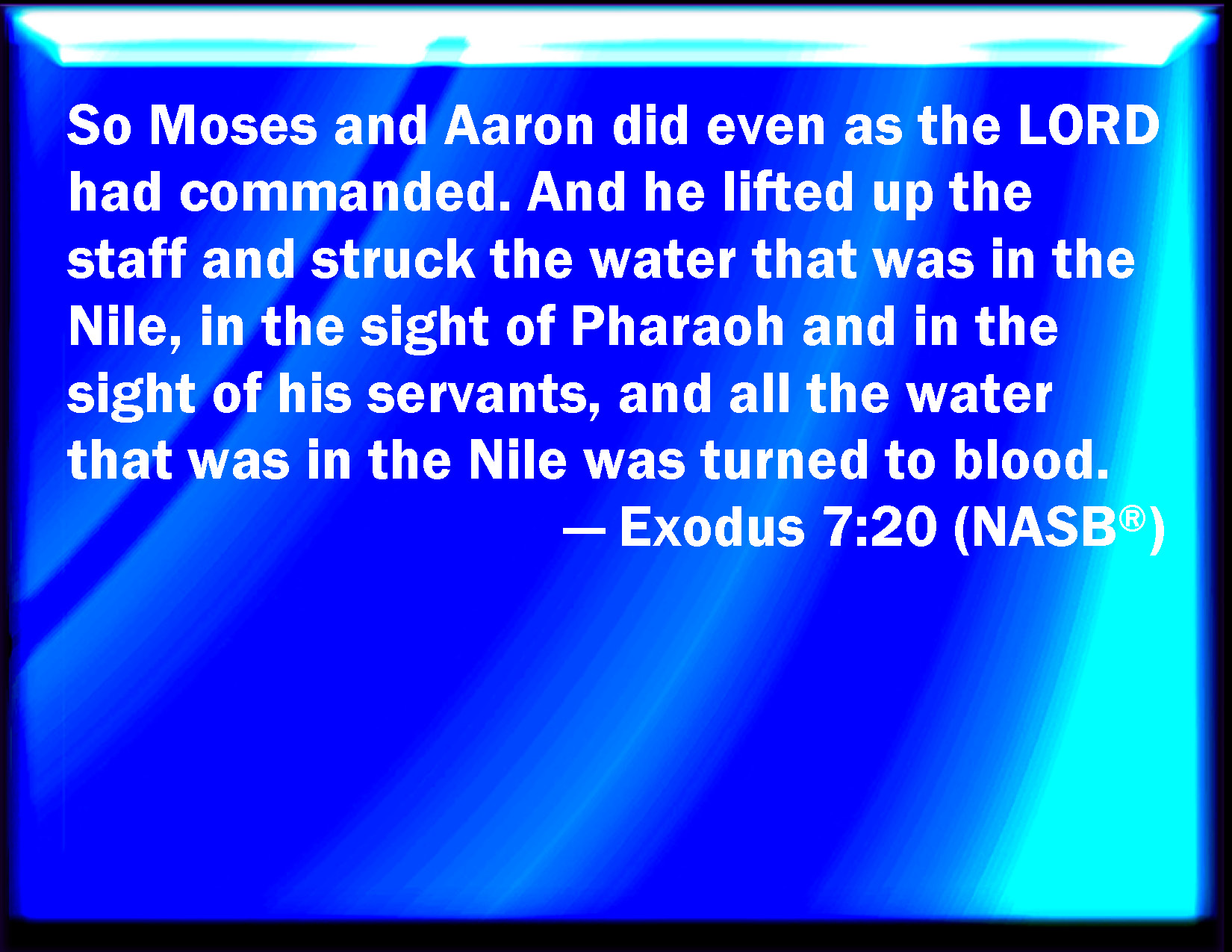 Bible Verse Slide Exodus 7:20 And Moses and Aaron did so, as the LORD commanded; and he lifted up the rod, and smote the waters that were in the river, in the sight of Pharaoh, and in the sight of his servants; and all the waters that were in the river were turned to blood. KJV: And Moses and Aaron did so, as the LORD commanded; and he lifted up the rod, and smote the waters that were in the river, in the sight of Pharaoh, and in the sight of his servants; and all the waters that were in the river were turned to blood. DRB: And Moses and Aaron did as the Lord had commanded: and lifting up the rod he struck the water of the river before Pharao and his servants: and it was turned into blood. DBT: And Moses and Aaron did so, as Jehovah had commanded; and he lifted up the staff, and smote the waters that were in the river before the eyes of Pharaoh, and before the eyes of his bondmen; and all the waters that were in the river were turned into blood. ERV: And Moses and Aaron did so, as the LORD commanded; and he lifted up the rod, and smote the waters that were in the river, in the sight of Pharaoh, and in the sight of his servants; and all the waters that were in the river were turned to blood. WBT: And Moses and Aaron did so, as the LORD commanded; and he lifted up the rod and smote the waters that were in the river, in the sight of Pharaoh, and in the sight of his servants; and all the waters that were in the river were turned into blood. WEB: Moses and Aaron did so, as Yahweh commanded; and he lifted up the rod, and struck the waters that were in the river, in the sight of Pharaoh, and in the sight of his servants; and all the waters that were in the river were turned to blood. YLT: And Moses and Aaron do so, as Jehovah hath commanded, and he lifteth up his hand with the rod, and smiteth the waters which are in the River, before the eyes of Pharaoh, and before the eyes of his servants, and all the waters which are in the River are turned to blood,Links Exodus 7:20 NIV • Exodus 7:20 NLT • Exodus 7:20 ESV • Exodus 7:20 NASB • Exodus 7:20 KJV • Exodus 7:20 Interlinear • Exodus 7:20 Commentaries • Exodus 7:20 Parallel Texts • Exodus 7:20 Bible Apps • Exodus 7:20 Parallel • Bible Hub |