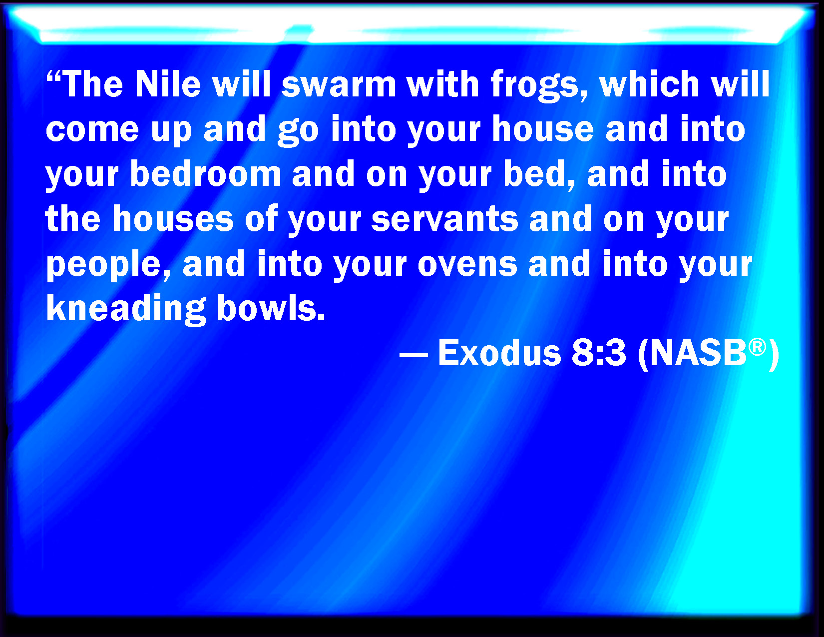 Bible Verse Slide Exodus 8:3 And the river shall bring forth frogs abundantly, which shall go up and come into your house, and into your bedchamber, and on your bed, and into the house of your servants, and on your people, and into your ovens, and into your kneading troughs: KJV: And the river shall bring forth frogs abundantly, which shall go up and come into thine house, and into thy bedchamber, and upon thy bed, and into the house of thy servants, and upon thy people, and into thine ovens, and into thy kneadingtroughs: DRB: And the river shall bring forth an abundance of frogs: which shall come up, and enter into thy house, and thy bedchamber, and upon thy bed, and in the houses of thy servants, and to thy people, and into thy ovens, and into the remains of thy meats; DBT: And the river shall swarm with frogs, and they shall go up and come into thy house, and into thy bedroom, and upon thy bed, and into the house of thy bondmen, and upon thy people, and into thine ovens, and into thy kneading-troughs. ERV: and the river shall swarm with frogs, which shall go up and come into thine house, and into thy bedchamber, and upon thy bed, and into the house of thy servants, and upon thy people, and into thine ovens, and into thy kneadingtroughs: WBT: And the river shall bring forth frogs abundantly, which shall go up and come into thy house, and into thy bed-chamber, and upon thy bed, and into the house of thy servants, and upon thy people, and into thy ovens, and into thy kneading troughs: WEB: and the river shall swarm with frogs, which shall go up and come into your house, and into your bedroom, and on your bed, and into the house of your servants, and on your people, and into your ovens, and into your kneading troughs: YLT: and the River hath teemed with frogs, and they have gone up and gone into thy house, and into the inner-chamber of thy bed, and on thy couch, and into the house of thy servants, and among thy people, and into thine ovens, and into thy kneading-troughs;Links Exodus 8:3 NIV • Exodus 8:3 NLT • Exodus 8:3 ESV • Exodus 8:3 NASB • Exodus 8:3 KJV • Exodus 8:3 Interlinear • Exodus 8:3 Commentaries • Exodus 8:3 Parallel Texts • Exodus 8:3 Bible Apps • Exodus 8:3 Parallel • Bible Hub |