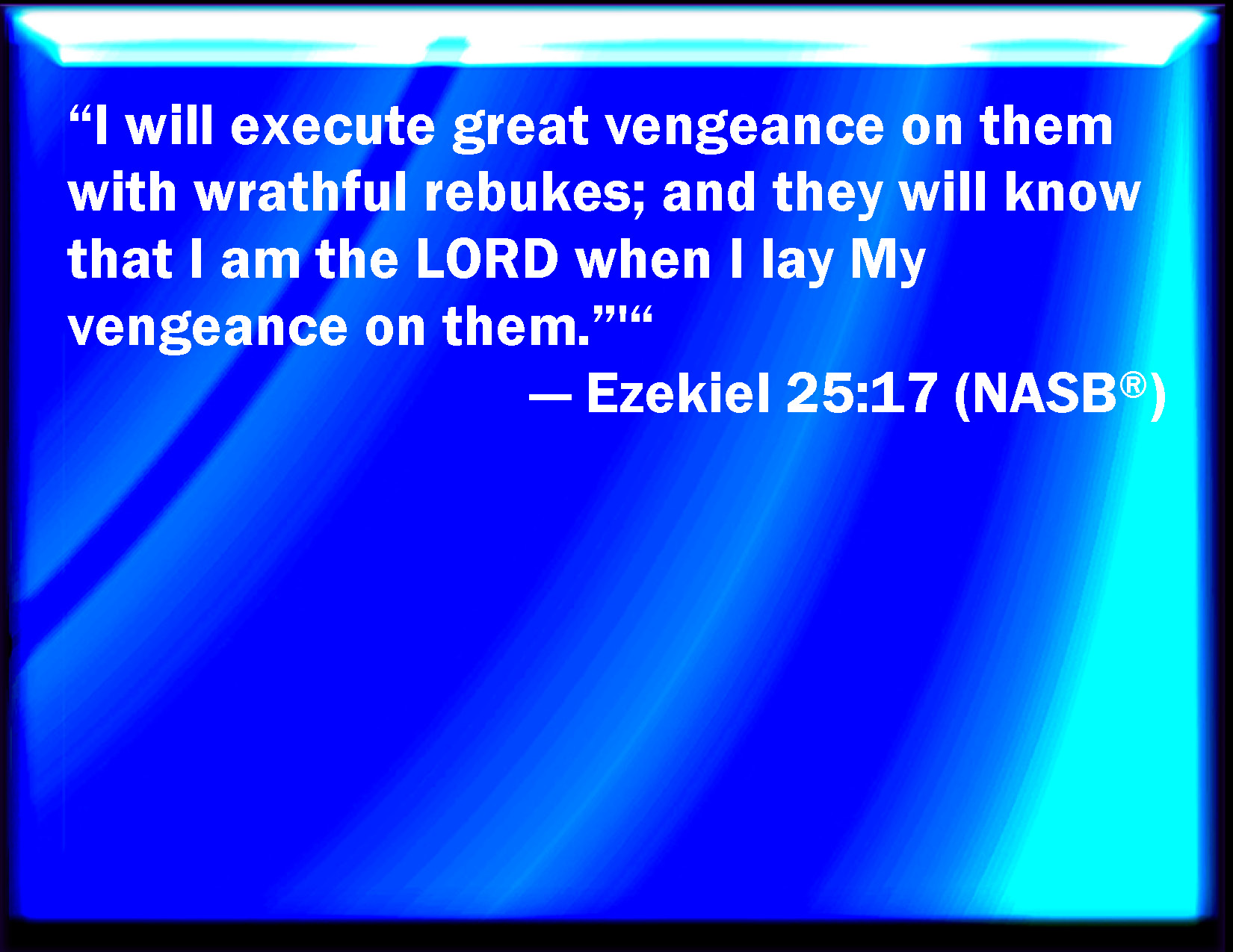 Bible Verse Slide Ezekiel 25:17 And I will execute great vengeance on them with furious rebukes; and they shall know that I am the LORD, when I shall lay my vengeance on them. KJV: And I will execute great vengeance upon them with furious rebukes; and they shall know that I am the LORD, when I shall lay my vengeance upon them. DRB: And I will execute great vengeance upon them, rebuking them in fury: and they shall know that I am the Lord, when I shall lay my vengeance upon them. DBT: And I will execute great vengeance upon them with furious rebukes; and they shall know that I am Jehovah, when I shall lay my vengeance upon them. ERV: And I will execute great vengeance upon them with furious rebukes; and they shall know that I am the LORD, when I shall lay my vengeance upon them. WBT: And I will execute great vengeance upon them with furious rebukes; and they shall know that I am the LORD, when I shall lay my vengeance upon them. WEB: I will execute great vengeance on them with wrathful rebukes; and they shall know that I am Yahweh, when I shall lay my vengeance on them. YLT: And done upon them great vengeance with furious reproofs, And they have known that I am Jehovah, In My giving out My vengeance on them!Links Ezekiel 25:17 NIV • Ezekiel 25:17 NLT • Ezekiel 25:17 ESV • Ezekiel 25:17 NASB • Ezekiel 25:17 KJV • Ezekiel 25:17 Interlinear • Ezekiel 25:17 Commentaries • Ezekiel 25:17 Parallel Texts • Ezekiel 25:17 Bible Apps • Ezekiel 25:17 Parallel • Bible Hub |