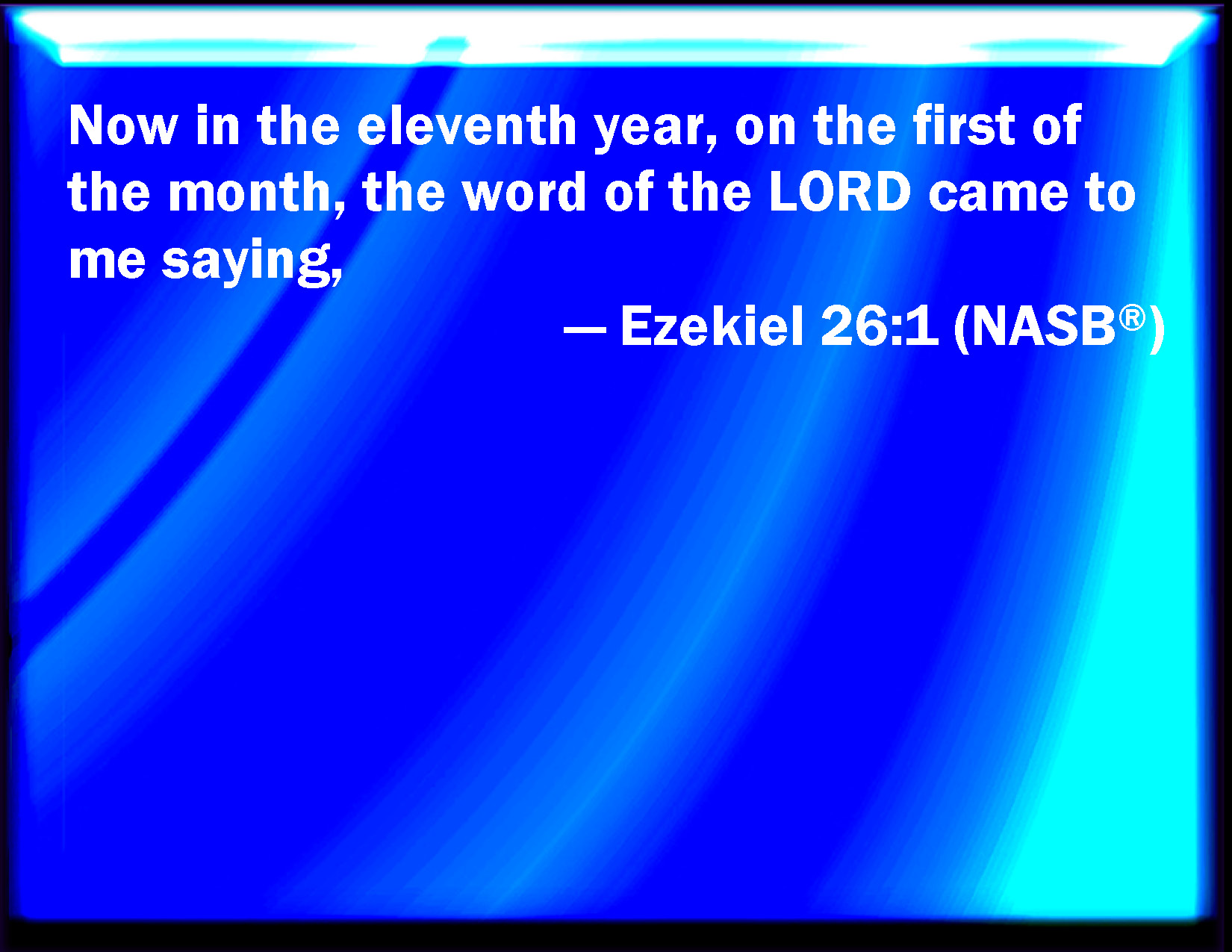 Bible Verse Slide Ezekiel 26:1 And it came to pass in the eleventh year, in the first day of the month, that the word of the LORD came to me, saying, KJV: And it came to pass in the eleventh year, in the first day of the month, that the word of the LORD came unto me, saying, DRB: And it came to pass in the eleventh year, the first day of the month, that the word of the Lord came to me, saying: DBT: And it came to pass in the eleventh year, on the first of the month, that the word of Jehovah came unto me, saying, ERV: And it came to pass in the eleventh year, in the first day of the month, that the word of the Lord came unto me, saying, WBT: And it came to pass in the eleventh year, in the first day of the month, that the word of the LORD came to me, saying, WEB: It happened in the eleventh year, in the first [day] of the month, that the word of Yahweh came to me, saying, YLT: And it cometh to pass, in the eleventh year, in the first of the month, there hath been a word of Jehovah unto me, saying: 'Son of man,Links Ezekiel 26:1 NIV • Ezekiel 26:1 NLT • Ezekiel 26:1 ESV • Ezekiel 26:1 NASB • Ezekiel 26:1 KJV • Ezekiel 26:1 Interlinear • Ezekiel 26:1 Commentaries • Ezekiel 26:1 Parallel Texts • Ezekiel 26:1 Bible Apps • Ezekiel 26:1 Parallel • Bible Hub |