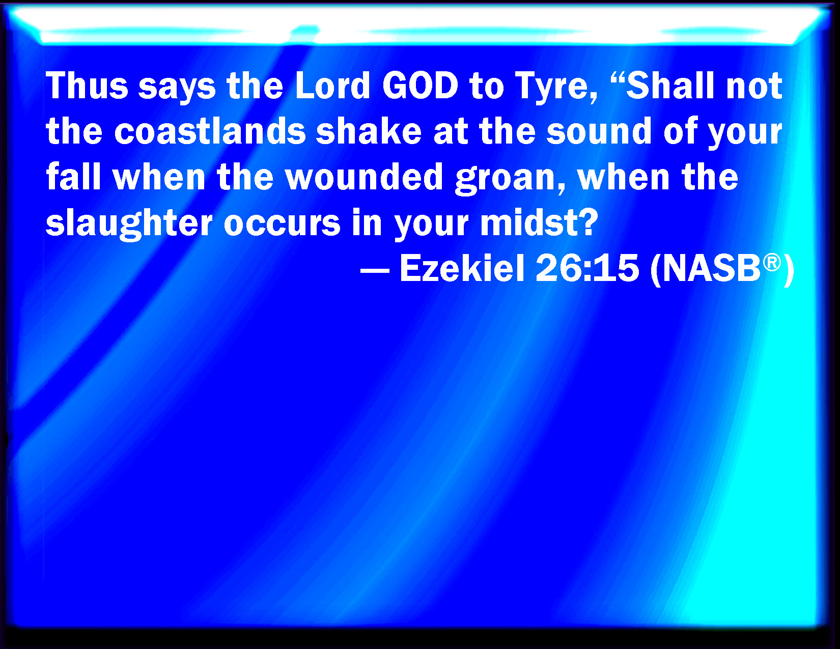 Bible Verse Slide Ezekiel 26:15 Thus said the Lord GOD to Tyrus; Shall not the isles shake at the sound of your fall, when the wounded cry, when the slaughter is made in the middle of you? KJV: Thus saith the Lord GOD to Tyrus; Shall not the isles shake at the sound of thy fall, when the wounded cry, when the slaughter is made in the midst of thee? DRB: Thus saith the Lord God to Tyre: Shall not the islands shake at the sound of thy fall, and the groans of thy slain when they shall be killed in the midst of thee? DBT: Thus saith the Lord Jehovah to Tyre: Shall not the isles shake at the sound of thy fall, when the wounded groan, when the slaughter is made in the midst of thee? ERV: Thus saith the Lord GOD to Tyre: Shall not the isles shake at the sound of thy fall, when the wounded groan, when the slaughter is made in the midst of thee? WBT: Thus saith the Lord GOD to Tyre; Shall not the isles shake at the sound of thy fall, when the wounded cry, when the slaughter is made in the midst of thee? WEB: Thus says the Lord Yahweh to Tyre: shall not the islands shake at the sound of your fall, when the wounded groan, when the slaughter is made in the midst of you? YLT: Thus said the Lord Jehovah to Tyre: Do not — from the noise of thy fall, In the groaning of the wounded, In the slaying of the slaughter in thy midst, The isles shake?Links Ezekiel 26:15 NIV • Ezekiel 26:15 NLT • Ezekiel 26:15 ESV • Ezekiel 26:15 NASB • Ezekiel 26:15 KJV • Ezekiel 26:15 Interlinear • Ezekiel 26:15 Commentaries • Ezekiel 26:15 Parallel Texts • Ezekiel 26:15 Bible Apps • Ezekiel 26:15 Parallel • Bible Hub |