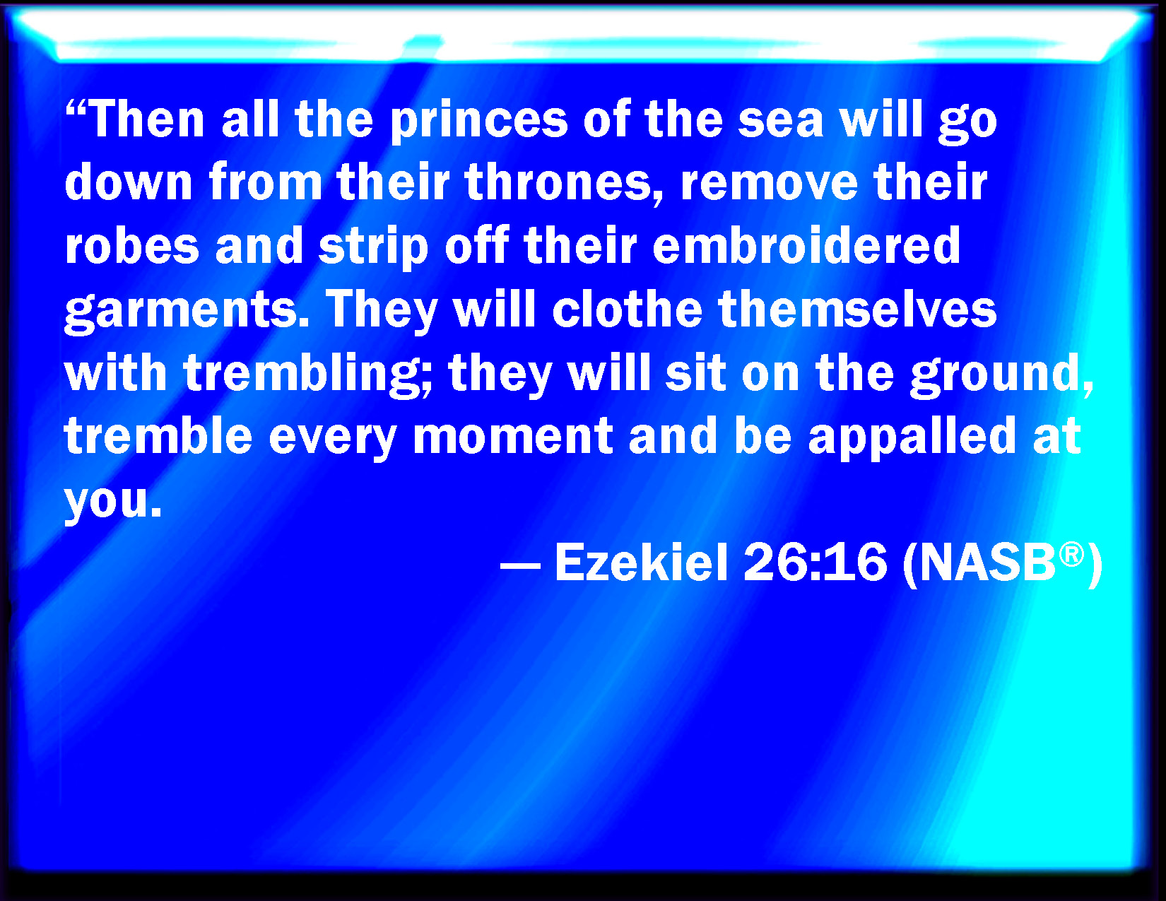 Bible Verse Slide Ezekiel 26:16 Then all the princes of the sea shall come down from their thrones, and lay away their robes, and put off their broidered garments: they shall clothe themselves with trembling; they shall sit on the ground, and shall tremble at every moment, and be astonished at you. KJV: Then all the princes of the sea shall come down from their thrones, and lay away their robes, and put off their broidered garments: they shall clothe themselves with trembling; they shall sit upon the ground, and shall tremble at every moment, and be astonished at thee. DRB: Then all the princes of the sea shall come down from their thrones: and take off their robes, and cast away their broidered garments, and be clothed with astonishment: they shall sit on the ground, and with amazement shall wonder at thy sudden fall. DBT: And all the princes of the sea shall come down from their thrones, and lay aside their robes, and put off their broidered garments: they shall clothe themselves with trembling, they shall sit upon the ground, and shall tremble every moment, and be astonied because of thee. ERV: Then all the princes of the sea shall come down from their thrones, and lay aside their robes, and strip off their broidered garments: they shall clothe themselves with trembling; they shall sit upon the ground, and shall tremble every moment, and be astonished at thee. WBT: Then all the princes of the sea shall come down from their thrones, and lay away their robes, and put off their broidered garments: they shall clothe themselves with trembling; they shall sit upon the ground, and shall tremble at every moment, and be astonished at thee. WEB: Then all the princes of the sea shall come down from their thrones, and lay aside their robes, and strip off their embroidered garments: they shall clothe themselves with trembling; they shall sit on the ground, and shall tremble every moment, and be astonished at you. YLT: And come down from off their thrones have all princes of the sea, And they have turned aside their robes, And their embroidered garments strip off, Trembling they put on, on the earth they sit, And they have trembled every moment, And they have been astonished at thee,Links Ezekiel 26:16 NIV • Ezekiel 26:16 NLT • Ezekiel 26:16 ESV • Ezekiel 26:16 NASB • Ezekiel 26:16 KJV • Ezekiel 26:16 Interlinear • Ezekiel 26:16 Commentaries • Ezekiel 26:16 Parallel Texts • Ezekiel 26:16 Bible Apps • Ezekiel 26:16 Parallel • Bible Hub |