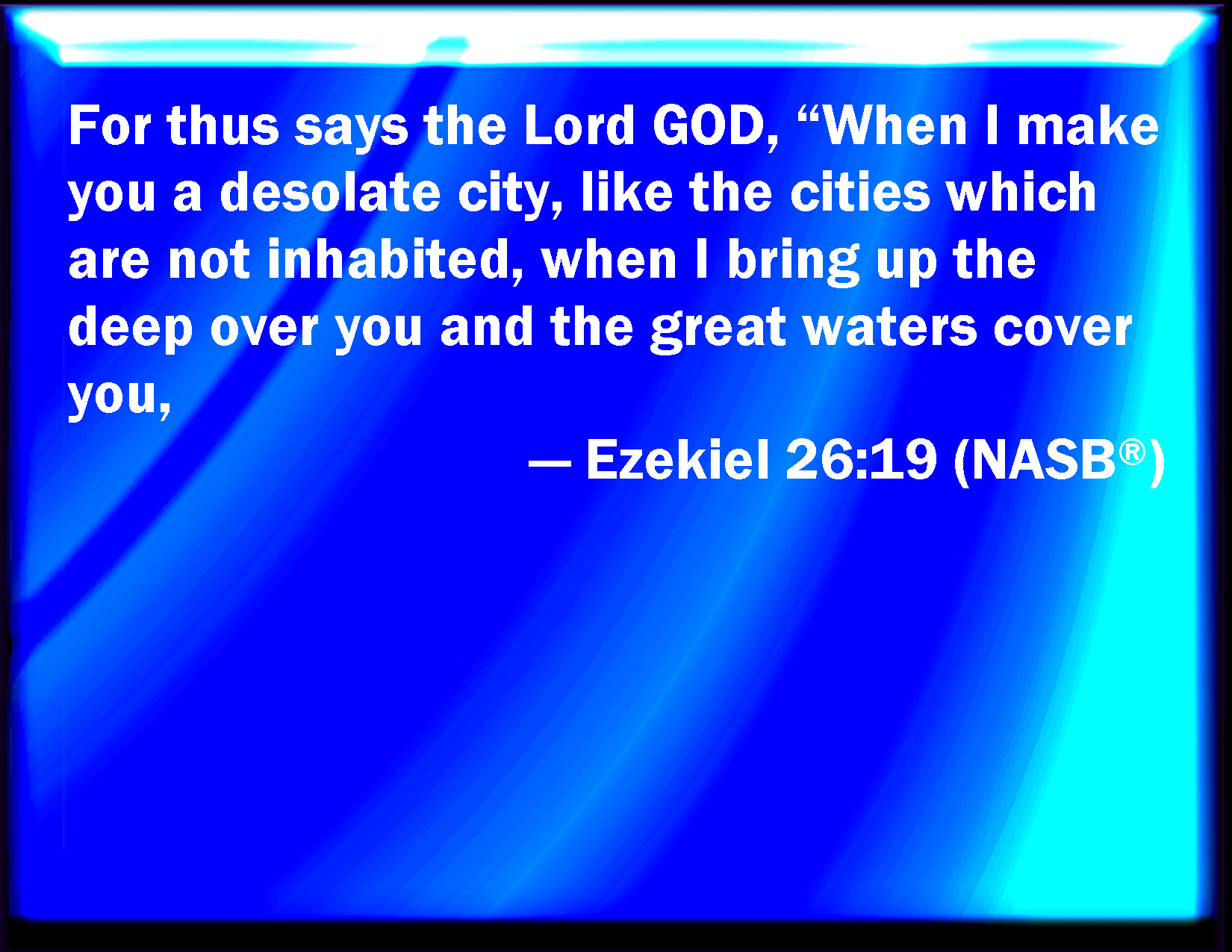 Bible Verse Slide Ezekiel 26:19 For thus said the Lord GOD; When I shall make you a desolate city, like the cities that are not inhabited; when I shall bring up the deep on you, and great waters shall cover you; KJV: For thus saith the Lord GOD; When I shall make thee a desolate city, like the cities that are not inhabited; when I shall bring up the deep upon thee, and great waters shall cover thee; DRB: For thus saith the Lord God: When I shall make thee a desolate city like the cities that are not inhabited: and shall bring the deep upon thee, and many waters shall cover thee: DBT: For thus saith the Lord Jehovah: When I shall make thee a desolate city, like the cities that are not inhabited; when I bring up the deep upon thee, and the great waters cover thee: ERV: For thus saith the Lord GOD: When I shall make thee a desolate city, like the cities that are not inhabited; when I shall bring up the deep upon thee, and the great waters shall cover thee; WBT: For thus saith the Lord GOD; When I shall make thee a desolate city, like the cities that are not inhabited; when I shall bring up the deep upon thee, and great waters shall cover thee; WEB: For thus says the Lord Yahweh: When I shall make you a desolate city, like the cities that are not inhabited; when I shall bring up the deep on you, and the great waters shall cover you; YLT: For thus said the Lord Jehovah: In my making thee a city wasted, Like cities that have not been inhabited, In bringing up against thee the deep, Then covered thee have the great waters.Links Ezekiel 26:19 NIV • Ezekiel 26:19 NLT • Ezekiel 26:19 ESV • Ezekiel 26:19 NASB • Ezekiel 26:19 KJV • Ezekiel 26:19 Interlinear • Ezekiel 26:19 Commentaries • Ezekiel 26:19 Parallel Texts • Ezekiel 26:19 Bible Apps • Ezekiel 26:19 Parallel • Bible Hub |