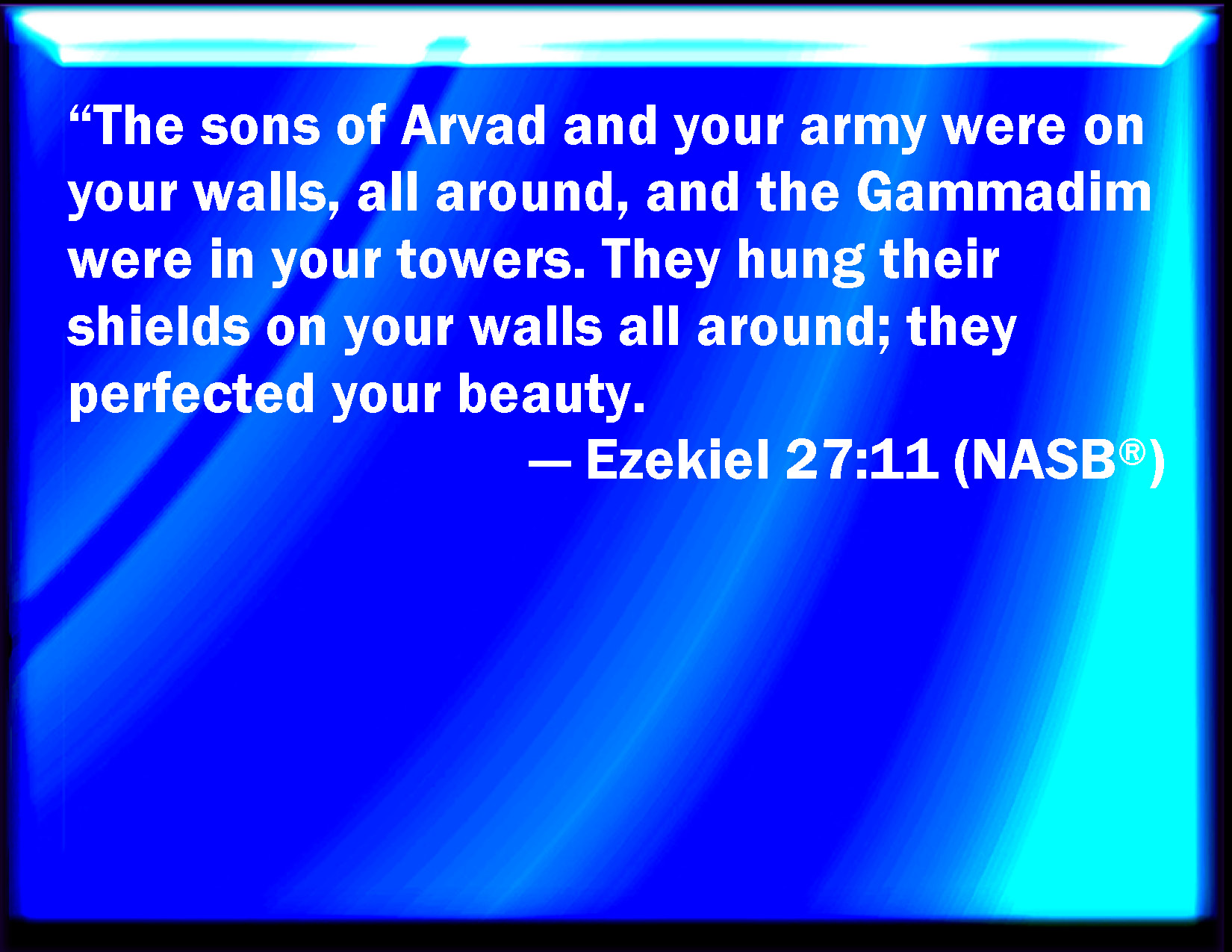 Bible Verse Slide Ezekiel 27:11 The men of Arvad with your army were on your walls round about, and the Gammadims were in your towers: they hanged their shields on your walls round about; they have made your beauty perfect. KJV: The men of Arvad with thine army were upon thy walls round about, and the Gammadims were in thy towers: they hanged their shields upon thy walls round about; they have made thy beauty perfect. DRB: The men of Arad were with thy army upon thy walls round about: the Pygmeans also that were in thy towers, hung up their quivers on thy walls round about: they perfected thy beauty. DBT: The children of Arvad with thine army were upon thy walls round about, and the Gammadim were on thy towers: they hanged their shields upon thy walls round about; they made thy beauty perfect. ERV: The men of Arvad with thine army were upon thy walls round about, and the Gammadim were in thy towers: they hanged their shields upon thy walls round about; they have perfected thy beauty. WBT: The men of Arvad with thy army were upon thy walls on all sides, and the Gammadims were in thy towers: they hung their shields upon thy walls on every side; they have made thy beauty perfect. WEB: The men of Arvad with your army were on your walls all around, and valorous men were in your towers; they hanged their shields on your walls all around; they have perfected your beauty. YLT: The sons of Arvad, and thy force, Are on thy walls round about, And short swordsmen in thy towers have been, Their shields they have hung up on thy walls round about, They — they have perfected thy beauty.Links Ezekiel 27:11 NIV • Ezekiel 27:11 NLT • Ezekiel 27:11 ESV • Ezekiel 27:11 NASB • Ezekiel 27:11 KJV • Ezekiel 27:11 Interlinear • Ezekiel 27:11 Commentaries • Ezekiel 27:11 Parallel Texts • Ezekiel 27:11 Bible Apps • Ezekiel 27:11 Parallel • Bible Hub |