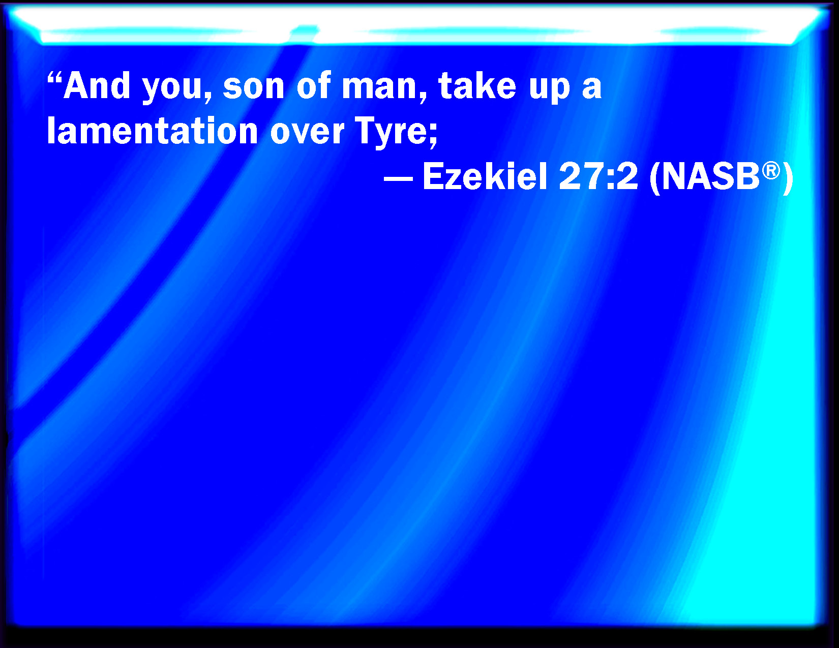 Bible Verse Slide Ezekiel 27:2 Now, you son of man, take up a lamentation for Tyrus; KJV: Now, thou son of man, take up a lamentation for Tyrus; DRB: Thou therefore, O son of man, take up a lamentation for Tyre: DBT: And thou, son of man, take up a lamentation for Tyre, ERV: And thou, son of man, take up a lamentation for Tyre; WBT: Now, thou son of man, take up a lamentation for Tyre; WEB: You, son of man, take up a lamentation over Tyre; YLT: 'And thou, son of man, lift up concerning Tyre a lamentation, and thou hast said to Tyre:Links Ezekiel 27:2 NIV • Ezekiel 27:2 NLT • Ezekiel 27:2 ESV • Ezekiel 27:2 NASB • Ezekiel 27:2 KJV • Ezekiel 27:2 Interlinear • Ezekiel 27:2 Commentaries • Ezekiel 27:2 Parallel Texts • Ezekiel 27:2 Bible Apps • Ezekiel 27:2 Parallel • Bible Hub |
