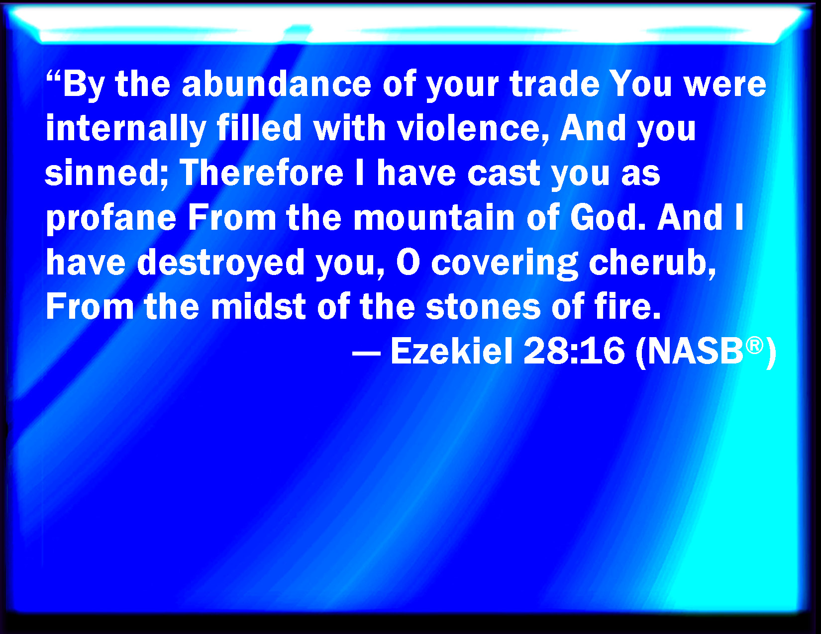 Bible Verse Slide Ezekiel 28:16 By the multitude of your merchandise they have filled the middle of you with violence, and you have sinned: therefore I will cast you as profane out of the mountain of God: and I will destroy you, O covering cherub, from the middle of the stones of fire. KJV: By the multitude of thy merchandise they have filled the midst of thee with violence, and thou hast sinned: therefore I will cast thee as profane out of the mountain of God: and I will destroy thee, O covering cherub, from the midst of the stones of fire. DRB: By the multitude of thy merchandise, thy inner parts were filled with iniquity, and thou hast sinned: and I cast thee out from the mountain of God, and destroyed thee, O covering cherub, out of the midst of the stones of fire. DBT: By the abundance of thy traffic they filled the midst of thee with violence, and thou hast sinned; therefore have I cast thee as profane from the mountain of God, and have destroyed thee, O covering cherub, from the midst of the stones of fire. ERV: By the multitude of they traffic they filled the midst of thee with violence, and thou hast sinned: therefore, have I cast thee as profane out of the mountain of God; and I have destroyed thee, O covering cherub, from the midst of the stones of fire. WBT: By the multitude of thy merchandise they have filled the midst of thee with violence, and thou hast sinned: therefore I will cast thee as profane out of the mountain of God: and I will destroy thee, O covering cherub, from the midst of the stones of fire. WEB: By the abundance of your traffic they filled the midst of you with violence, and you have sinned: therefore I have cast you as profane out of the mountain of God; and I have destroyed you, covering cherub, from the midst of the stones of fire. YLT: By the abundance of thy merchandise They have filled thy midst with violence, And thou dost sin, And I thrust thee from the mount of God, And I destroy thee, O covering cherub, From the midst of the stones of fire.Links Ezekiel 28:16 NIV • Ezekiel 28:16 NLT • Ezekiel 28:16 ESV • Ezekiel 28:16 NASB • Ezekiel 28:16 KJV • Ezekiel 28:16 Interlinear • Ezekiel 28:16 Commentaries • Ezekiel 28:16 Parallel Texts • Ezekiel 28:16 Bible Apps • Ezekiel 28:16 Parallel • Bible Hub |
