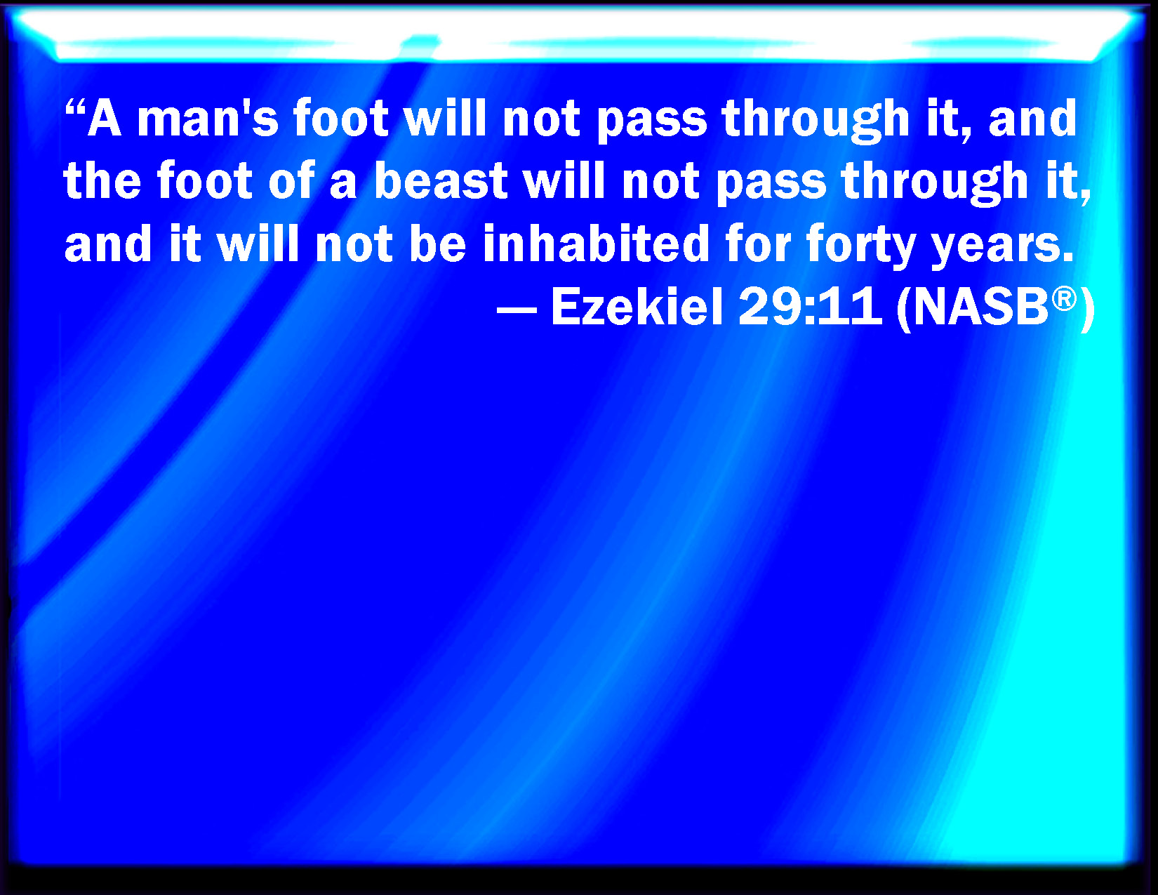 Bible Verse Slide Ezekiel 29:11 No foot of man shall pass through it, nor foot of beast shall pass through it, neither shall it be inhabited forty years. KJV: No foot of man shall pass through it, nor foot of beast shall pass through it, neither shall it be inhabited forty years. DRB: The foot of man shall not pass through it, neither shall the foot of beasts go through it: nor shall it be inhabited during forty years. DBT: No foot of man shall pass through it, nor shall foot of beast pass through it, nor shall it be inhabited, forty years. ERV: No foot of man shall pass through it, nor foot of beast shall pass through it, neither shall it be inhabited forty years. WBT: No foot of man shall pass through it, nor foot of beast shall pass through it, neither shall it be inhabited forty years. WEB: No foot of man shall pass through it, nor foot of animal shall pass through it, neither shall it be inhabited forty years. YLT: Not pass over into it doth a foot of man, Yea, the foot of beast doth not pass into it, Nor is it inhabited forty years.Links Ezekiel 29:11 NIV • Ezekiel 29:11 NLT • Ezekiel 29:11 ESV • Ezekiel 29:11 NASB • Ezekiel 29:11 KJV • Ezekiel 29:11 Interlinear • Ezekiel 29:11 Commentaries • Ezekiel 29:11 Parallel Texts • Ezekiel 29:11 Bible Apps • Ezekiel 29:11 Parallel • Bible Hub |