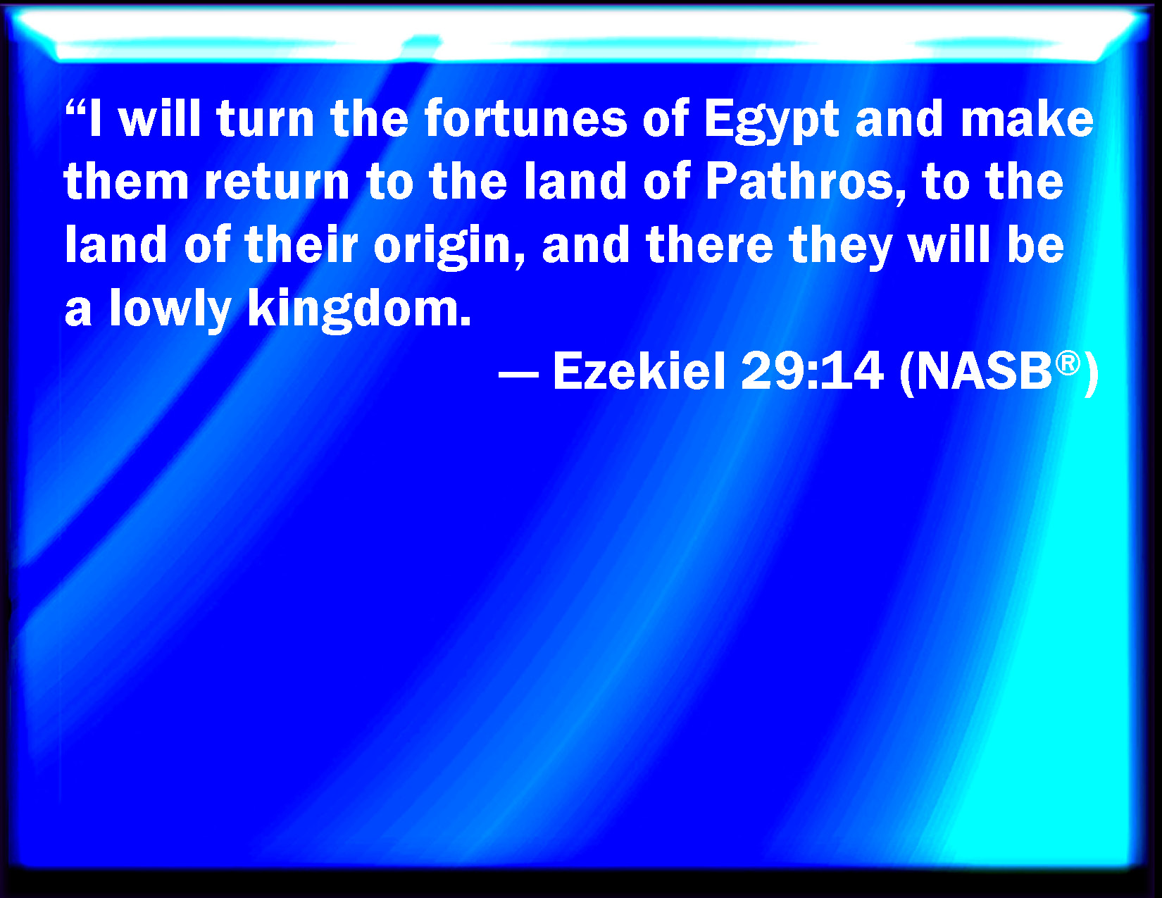 Bible Verse Slide Ezekiel 29:14 And I will bring again the captivity of Egypt, and will cause them to return into the land of Pathros, into the land of their habitation; and they shall be there a base kingdom. KJV: And I will bring again the captivity of Egypt, and will cause them to return into the land of Pathros, into the land of their habitation; and they shall be there a base kingdom. DRB: And I will bring hack the captivity of Egypt, and will place them in the land of Phatures, in the land of their nativity, and they shall be there a low kingdom: DBT: and I will turn again the captivity of Egypt, and will cause them to return to the land of Pathros, into the land of their birth, and they shall there be a base kingdom. ERV: and I will bring again the captivity of Egypt, and will cause them to return into the land of Pathros, into the land of their birth; and they shall be there a base kingdom. WBT: And I will bring again the captivity of Egypt, and will cause them to return into the land of Pathros, into the land of their habitation; and they shall be there a base kingdom. WEB: and I will bring back the captivity of Egypt, and will cause them to return into the land of Pathros, into the land of their birth; and they shall be there a base kingdom. YLT: And I have turned back to the captivity of Egypt, And I have brought them back To the land of Pathros, to the land of their birth, And they have been there a low kingdom.Links Ezekiel 29:14 NIV • Ezekiel 29:14 NLT • Ezekiel 29:14 ESV • Ezekiel 29:14 NASB • Ezekiel 29:14 KJV • Ezekiel 29:14 Interlinear • Ezekiel 29:14 Commentaries • Ezekiel 29:14 Parallel Texts • Ezekiel 29:14 Bible Apps • Ezekiel 29:14 Parallel • Bible Hub |