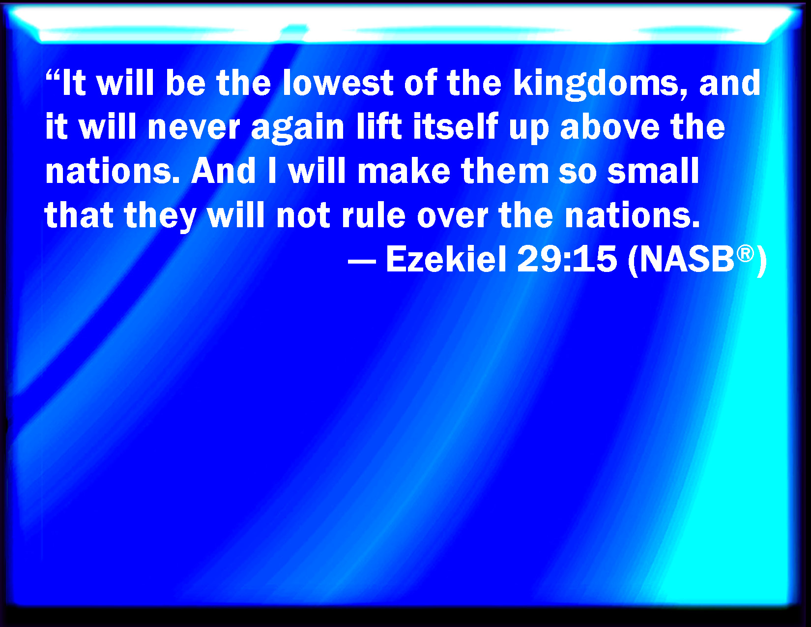 Bible Verse Slide Ezekiel 29:15 It shall be the basest of the kingdoms; neither shall it exalt itself any more above the nations: for I will diminish them, that they shall no more rule over the nations. KJV: It shall be the basest of the kingdoms; neither shall it exalt itself any more above the nations: for I will diminish them, that they shall no more rule over the nations. DRB: It shall be the lowest among other kingdoms, and it shall no more be exalted over the nations, and I will diminish them that they shall rule no more over the nations. DBT: It shall be the basest of kingdoms; neither shall it exalt itself any more above the nations; and I will diminish them, so that they shall no more rule over the nations. ERV: It shall be the basest of the kingdoms; neither shall it any more lift itself up above the nations: and I will diminish them, that they shall no more rule over the nations. WBT: It shall be the basest of the kingdoms; neither shall it exalt itself any more above the nations: for I will diminish them, that they shall no more rule over the nations. WEB: It shall be the base of the kingdoms; neither shall it any more lift itself up above the nations: and I will diminish them, that they shall no more rule over the nations. YLT: Of the kingdoms it is lowest, And it lifteth not up itself any more above the nations, And I have made them few, So as not to rule among nations.Links Ezekiel 29:15 NIV • Ezekiel 29:15 NLT • Ezekiel 29:15 ESV • Ezekiel 29:15 NASB • Ezekiel 29:15 KJV • Ezekiel 29:15 Interlinear • Ezekiel 29:15 Commentaries • Ezekiel 29:15 Parallel Texts • Ezekiel 29:15 Bible Apps • Ezekiel 29:15 Parallel • Bible Hub |