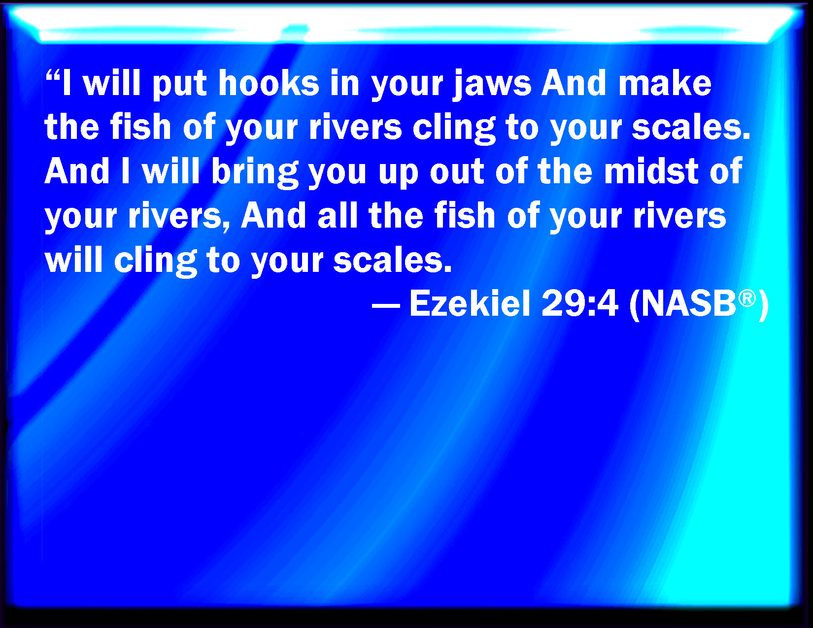 Bible Verse Slide Ezekiel 29:4 But I will put hooks in your jaws, and I will cause the fish of your rivers to stick to your scales, and I will bring you up out of the middle of your rivers, and all the fish of your rivers shall stick to your scales. KJV: But I will put hooks in thy jaws, and I will cause the fish of thy rivers to stick unto thy scales, and I will bring thee up out of the midst of thy rivers, and all the fish of thy rivers shall stick unto thy scales. DRB: But I will put a bridle in thy jaws: and I will cause the fish of thy rivers to stick to thy scales: and I will draw thee out of the midst of thy rivers, and all thy fish shall stick to thy scales. DBT: And I will put hooks in thy jaws, and I will cause the fish of thy rivers to stick unto thy scales, and I will bring thee up out of the midst of thy rivers, and all the fish of thy rivers shall stick unto thy scales; ERV: And I will put hooks in thy jaws, and I will cause the fish of thy rivers to stick unto thy scales; and I will bring thee up out of the midst of thy rivers, with all the fish of thy rivers which stick unto thy scales. WBT: But I will put hooks in thy jaws, and I will cause the fish of thy rivers to stick to thy scales, and I will bring thee out of the midst of thy rivers, and all the fish of thy rivers shall stick to thy scales. WEB: I will put hooks in your jaws, and I will make the fish of your rivers stick to your scales; and I will bring you up out of the midst of your rivers, with all the fish of your rivers which stick to your scales. YLT: And I have put hooks in thy jaws, And I have caused the fish of thy floods to cleave to thy scales, And I have caused thee to come up from the midst of thy floods, And every fish of thy floods to thy scales doth cleave.Links Ezekiel 29:4 NIV • Ezekiel 29:4 NLT • Ezekiel 29:4 ESV • Ezekiel 29:4 NASB • Ezekiel 29:4 KJV • Ezekiel 29:4 Interlinear • Ezekiel 29:4 Commentaries • Ezekiel 29:4 Parallel Texts • Ezekiel 29:4 Bible Apps • Ezekiel 29:4 Parallel • Bible Hub |