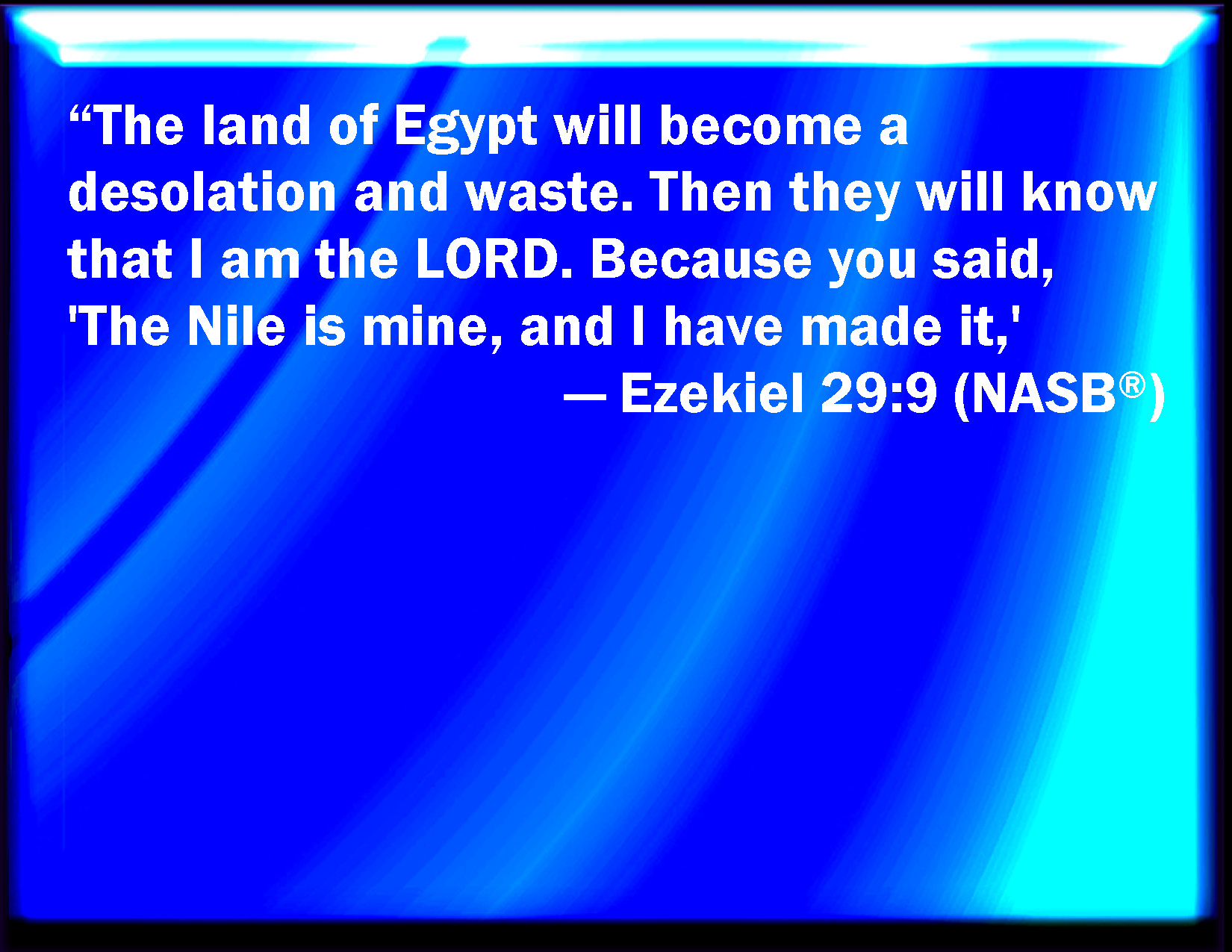 Bible Verse Slide Ezekiel 29:9 And the land of Egypt shall be desolate and waste; and they shall know that I am the LORD: because he has said, The river is mine, and I have made it. KJV: And the land of Egypt shall be desolate and waste; and they shall know that I am the LORD: because he hath said, The river is mine, and I have made it. DRB: And the land of Egypt shall become a desert, and a wilderness: and they shall know that I am the Lord: because thou hast said: The river is mine, and I made DBT: And the land of Egypt shall be a desolation and a waste: and they shall know that I am Jehovah, because he saith, The river is mine, and I made it. ERV: And the land of Egypt shall be a desolation and a waste; and they shall know that I am the LORD: because he hath said, The river is mine, and I have made it. WBT: And the land of Egypt shall be desolate and waste; and they shall know that I am the LORD: because he hath said, The river is mine, and I have made it. WEB: The land of Egypt shall be a desolation and a waste; and they shall know that I am Yahweh. Because he has said, 'The river is mine, and I have made it;' YLT: And the land of Egypt hath been for a desolation and a waste, And they have known that I am Jehovah. Because he said: The flood is mine, and I made it.Links Ezekiel 29:9 NIV • Ezekiel 29:9 NLT • Ezekiel 29:9 ESV • Ezekiel 29:9 NASB • Ezekiel 29:9 KJV • Ezekiel 29:9 Interlinear • Ezekiel 29:9 Commentaries • Ezekiel 29:9 Parallel Texts • Ezekiel 29:9 Bible Apps • Ezekiel 29:9 Parallel • Bible Hub |