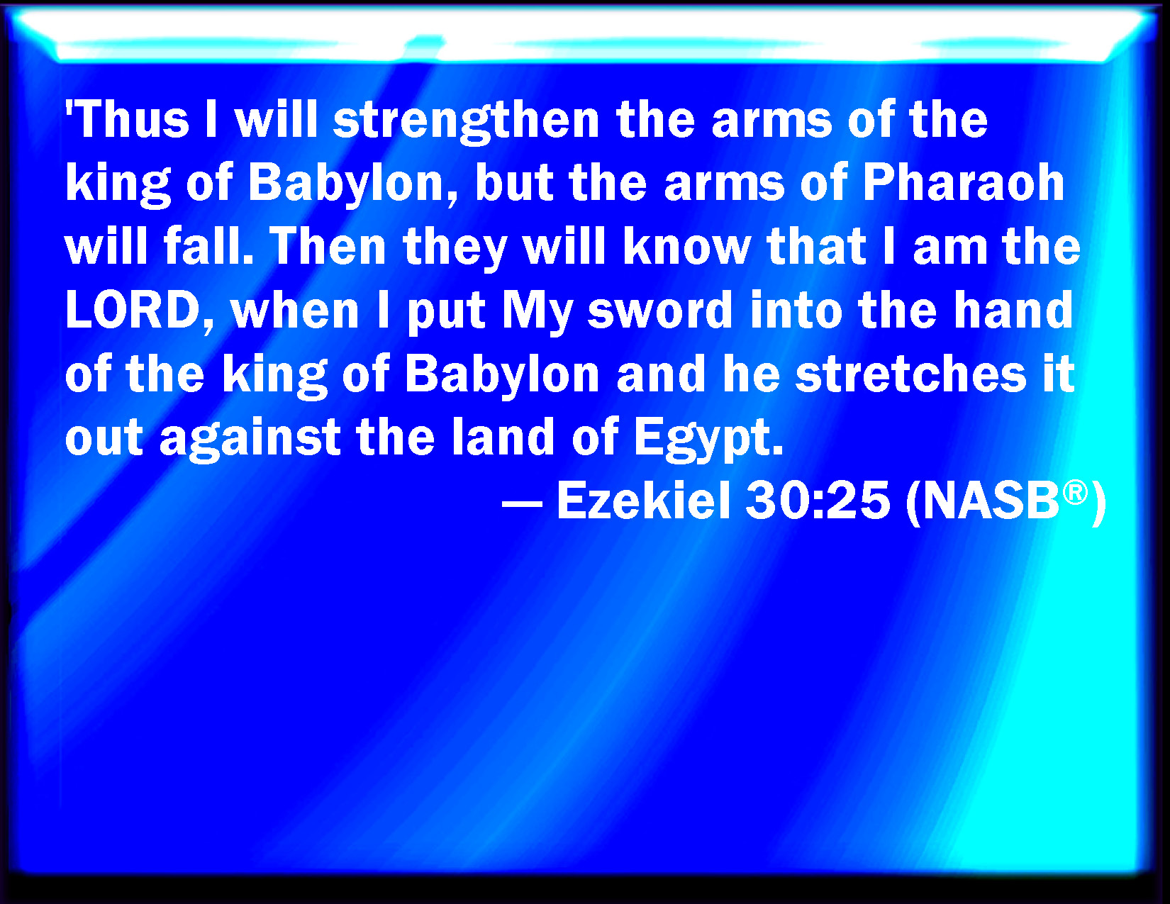 Bible Verse Slide Ezekiel 30:25 But I will strengthen the arms of the king of Babylon, and the arms of Pharaoh shall fall down; and they shall know that I am the LORD, when I shall put my sword into the hand of the king of Babylon, and he shall stretch it out on the land of Egypt. KJV: But I will strengthen the arms of the king of Babylon, and the arms of Pharaoh shall fall down; and they shall know that I am the LORD, when I shall put my sword into the hand of the king of Babylon, and he shall stretch it out upon the land of Egypt. DRB: And I will strengthen the arms of the king of Babylon, and the arms of Pharao shall fall: and they shall know that I am the Lord, when I shall have given my sword into the hand of the king of Babylon, and he shall have stretched it forth upon the land of Egypt. DBT: And I will strengthen the arms of the king of Babylon, and the arms of Pharaoh shall fall down; and they shall know that I am Jehovah, when I have put my sword into the hand of the king of Babylon, and he shall have stretched it out upon the land of Egypt. ERV: And I will hold up the arms of the king of Babylon, and the arms of Pharaoh shall fall down; and they shall know that I am the LORD, when I shall put my sword into the hand of the king of Babylon, and he shall stretch it out upon the land of Egypt. WBT: But I will strengthen the arms of the king of Babylon, and the arms of Pharaoh shall fall down; and they shall know that I am the LORD, when I shall put my sword into the hand of the king of Babylon, and he shall stretch it out upon the land of Egypt. WEB: I will hold up the arms of the king of Babylon; and the arms of Pharaoh shall fall down; and they shall know that I am Yahweh, when I shall put my sword into the hand of the king of Babylon, and he shall stretch it out on the land of Egypt. YLT: And I have strengthened the arms of the king of Babylon, And the arms of Pharaoh do fall down, And they have known that I am Jehovah, In My giving My sword into the hand of the king of Babylon, And he hath stretched it out toward the land of Egypt.Links Ezekiel 30:25 NIV • Ezekiel 30:25 NLT • Ezekiel 30:25 ESV • Ezekiel 30:25 NASB • Ezekiel 30:25 KJV • Ezekiel 30:25 Interlinear • Ezekiel 30:25 Commentaries • Ezekiel 30:25 Parallel Texts • Ezekiel 30:25 Bible Apps • Ezekiel 30:25 Parallel • Bible Hub |