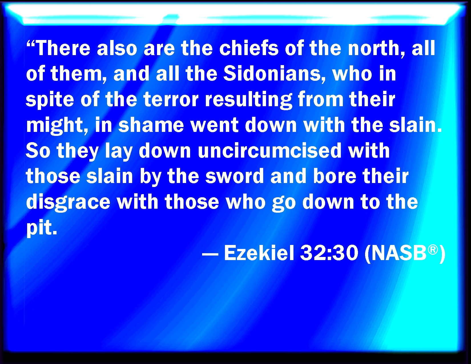 Bible Verse Slide Ezekiel 32:30 There be the princes of the north, all of them, and all the Zidonians, which are gone down with the slain; with their terror they are ashamed of their might; and they lie uncircumcised with them that be slain by the sword, and bear their shame with them that go down to the pit. KJV: There be the princes of the north, all of them, and all the Zidonians, which are gone down with the slain; with their terror they are ashamed of their might; and they lie uncircumcised with them that be slain by the sword, and bear their shame with them that go down to the pit. DRB: There are all the princes of the north, and all the hunters: who were brought down with the slain, fearing, and con- founded in their strength: who slept uncircumcised with them that are slain by the sword, and have borne their shame with them that go down into the pit. DBT: There are the princes of the north, all of them, and all the Zidonians, that are gone down with the slain ashamed of the terror which they caused through their might; and they lie uncircumcised with them that are slain by the sword, and bear their confusion with them that go down to the pit. ERV: There be the princes of the north, all of them, and all the Zidonians, which are gone down with the slain; in the terror which they caused by their might they are ashamed; and they lie uncircumcised with them that are slain by the sword, and bear their shame with them that go down to the pit. WBT: There are the princes of the north, all of them, and all the Zidonians, who are gone down with the slain; with their terror they are ashamed of their might; and they lie uncircumcised with them that are slain by the sword, and bear their shame with them that go down to the pit. WEB: There are the princes of the north, all of them, and all the Sidonians, who are gone down with the slain; in the terror which they caused by their might they are put to shame; and they lie uncircumcised with those who are slain by the sword, and bear their shame with those who go down to the pit. YLT: There are princes of the north, All of them, and every Zidonian, Who have gone down with the pierced in their terror, Of their might they are ashamed, And they lie uncircumcised with the pierced of the sword, And they bear their shame with those going down to the pit.Links Ezekiel 32:30 NIV • Ezekiel 32:30 NLT • Ezekiel 32:30 ESV • Ezekiel 32:30 NASB • Ezekiel 32:30 KJV • Ezekiel 32:30 Interlinear • Ezekiel 32:30 Commentaries • Ezekiel 32:30 Parallel Texts • Ezekiel 32:30 Bible Apps • Ezekiel 32:30 Parallel • Bible Hub |