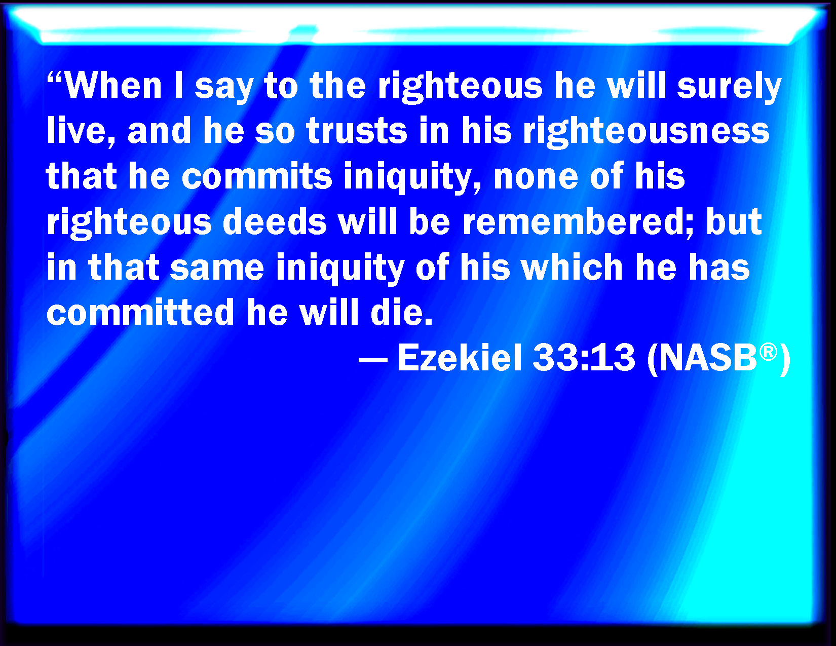 Bible Verse Slide Ezekiel 33:13 When I shall say to the righteous, that he shall surely live; if he trust to his own righteousness, and commit iniquity, all his righteousnesses shall not be remembered; but for his iniquity that he has committed, he shall die for it. KJV: When I shall say to the righteous, that he shall surely live; if he trust to his own righteousness, and commit iniquity, all his righteousnesses shall not be remembered; but for his iniquity that he hath committed, he shall die for it. DRB: Yea, if I shall say to the just that he shall surely live, and he, trusting in his justice, commit iniquity: all his justices shall be forgotten, and in his iniquity, which he hath committed, in the same shall he die. DBT: When I say to the righteous that he shall certainly live, and he trusteth to his righteousness and doeth what is wrong, none of his righteous acts shall be remembered; but in his unrighteousness which he hath done, in it shall he die. ERV: When I say to the righteous, that he shall surely live; if he trust to his righteousness, and commit iniquity, none of his righteous deeds shall be remembered; but in his iniquity that he hath committed, therein shall he die. WBT: When I shall say to the righteous, that he shall surely live; if he shall trust to his own righteousness, and commit iniquity, all his righteousnesses shall not be remembered; but for his iniquity that he hath committed, he shall die for it. WEB: When I tell the righteous, that he shall surely live; if he trust to his righteousness, and commit iniquity, none of his righteous deeds shall be remembered; but in his iniquity that he has committed, therein shall he die. YLT: In My saying of the righteous: He surely liveth, And — he hath trusted on his righteousness, And he hath done perversity, All his righteous acts are not remembered, And for his perversity that he hath done, For it he doth die.Links Ezekiel 33:13 NIV • Ezekiel 33:13 NLT • Ezekiel 33:13 ESV • Ezekiel 33:13 NASB • Ezekiel 33:13 KJV • Ezekiel 33:13 Interlinear • Ezekiel 33:13 Commentaries • Ezekiel 33:13 Parallel Texts • Ezekiel 33:13 Bible Apps • Ezekiel 33:13 Parallel • Bible Hub |