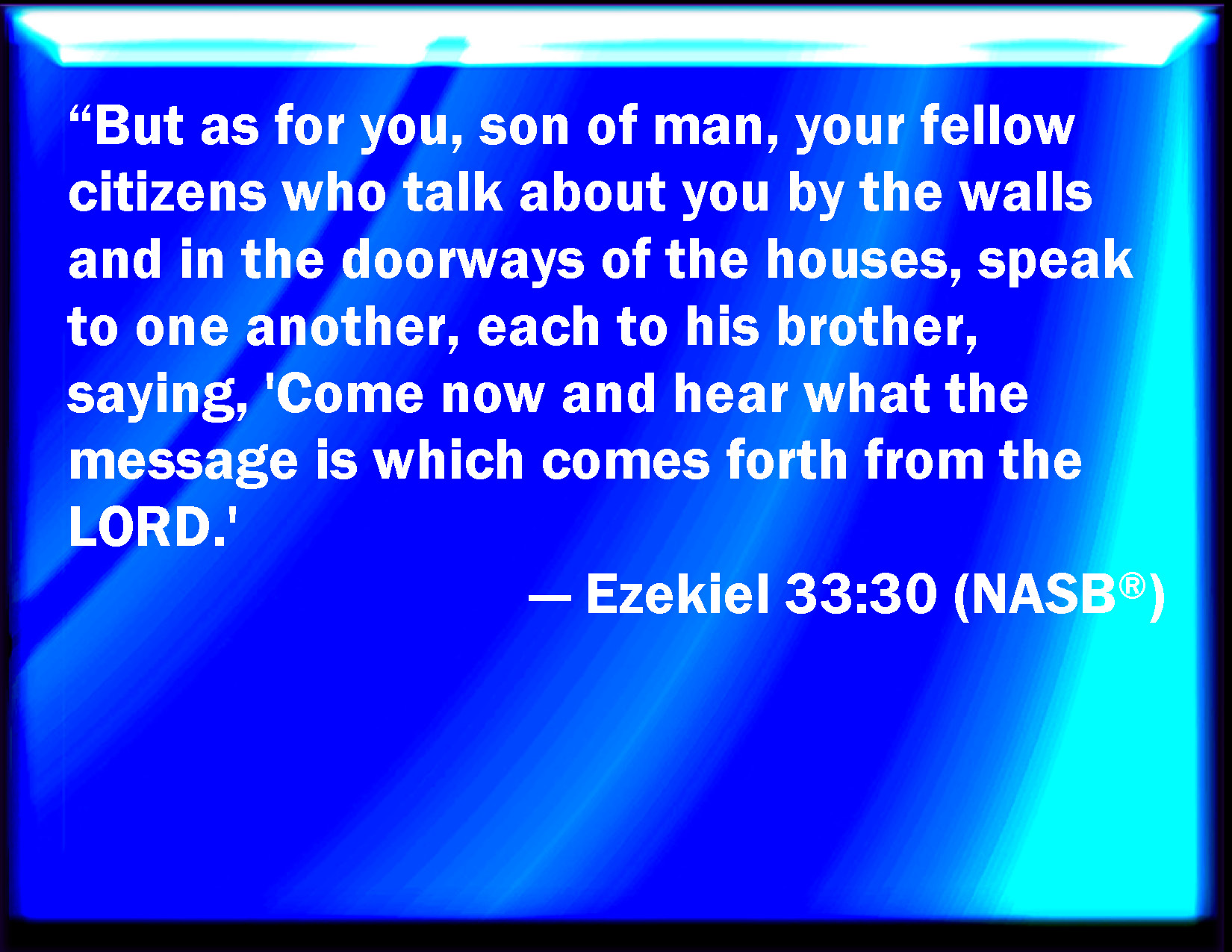 Bible Verse Slide Ezekiel 33:30 Also, you son of man, the children of your people still are talking against you by the walls and in the doors of the houses, and speak one to another, every one to his brother, saying, Come, I pray you, and hear what is the word that comes forth from the LORD. KJV: Also, thou son of man, the children of thy people still are talking against thee by the walls and in the doors of the houses, and speak one to another, every one to his brother, saying, Come, I pray you, and hear what is the word that cometh forth from the LORD. DRB: And thou son of man: the children of thy people, that talk of thee by the walls, and in the doors of the houses, and speak one to another each men to his neighbour, saying: Come, and let us hear what is the word that cometh forth from the Lord. DBT: And as for thee, son of man, the children of thy people keep talking of thee by the walls and in the doors of the houses, and speak one to another, every one to his brother, saying, Come, I pray you, and hear what is the word that cometh forth from Jehovah. ERV: And as for thee, son of man, the children of thy people talk of thee by the walls and in the doors of the houses, and speak one to another, everyone to his brother, saying, Come, I pray you, and hear what is the word that cometh forth from the LORD. WBT: Also, thou son of man, the children of thy people still are talking against thee by the walls and in the doors of the houses, and speak one to another, every one to his brother, saying, Come, I pray you, and hear what is the word that cometh forth from the LORD. WEB: As for you, son of man, the children of your people talk of you by the walls and in the doors of the houses, and speak one to another, everyone to his brother, saying, Please come and hear what is the word that comes forth from Yahweh. YLT: And thou, son of man, the sons of thy people who are speaking about thee, By the walls, and in openings of the houses, Have spoken one with another, each with his brother, Saying: Come in, I pray you, And hear what is the word that cometh out from Jehovah.Links Ezekiel 33:30 NIV • Ezekiel 33:30 NLT • Ezekiel 33:30 ESV • Ezekiel 33:30 NASB • Ezekiel 33:30 KJV • Ezekiel 33:30 Interlinear • Ezekiel 33:30 Commentaries • Ezekiel 33:30 Parallel Texts • Ezekiel 33:30 Bible Apps • Ezekiel 33:30 Parallel • Bible Hub |