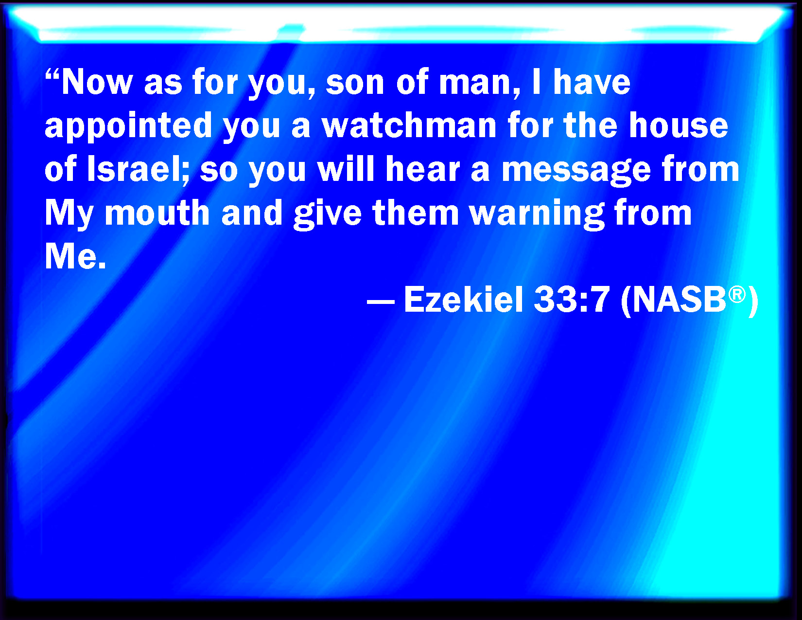 Bible Verse Slide Ezekiel 33:7 So you, O son of man, I have set you a watchman to the house of Israel; therefore you shall hear the word at my mouth, and warn them from me. KJV: So thou, O son of man, I have set thee a watchman unto the house of Israel; therefore thou shalt hear the word at my mouth, and warn them from me. DRB: So thou, O son of man, I have made thee a watchman to the house of Israel: therefore thou shalt hear the word from my mouth, and shalt tell it them from me. DBT: So thou, son of man, I have set thee a watchman unto the house of Israel; and thou shalt hear the word from my mouth, and warn them from me. ERV: So thou, son of man, I have set thee a watchman unto the house of Israel; therefore hear the word at my mouth, and give them warning from me. WBT: So thou, O son of man, I have set thee a watchman to the house of Israel; therefore thou shalt hear the word at my mouth, and warn them from me. WEB: So you, son of man, I have set you a watchman to the house of Israel; therefore hear the word at my mouth, and give them warning from me. YLT: And thou, son of man, A watchman I gave thee to the house of Israel, And thou hast heard from My mouth a word, And thou hast warned them from Me.Links Ezekiel 33:7 NIV • Ezekiel 33:7 NLT • Ezekiel 33:7 ESV • Ezekiel 33:7 NASB • Ezekiel 33:7 KJV • Ezekiel 33:7 Interlinear • Ezekiel 33:7 Commentaries • Ezekiel 33:7 Parallel Texts • Ezekiel 33:7 Bible Apps • Ezekiel 33:7 Parallel • Bible Hub |