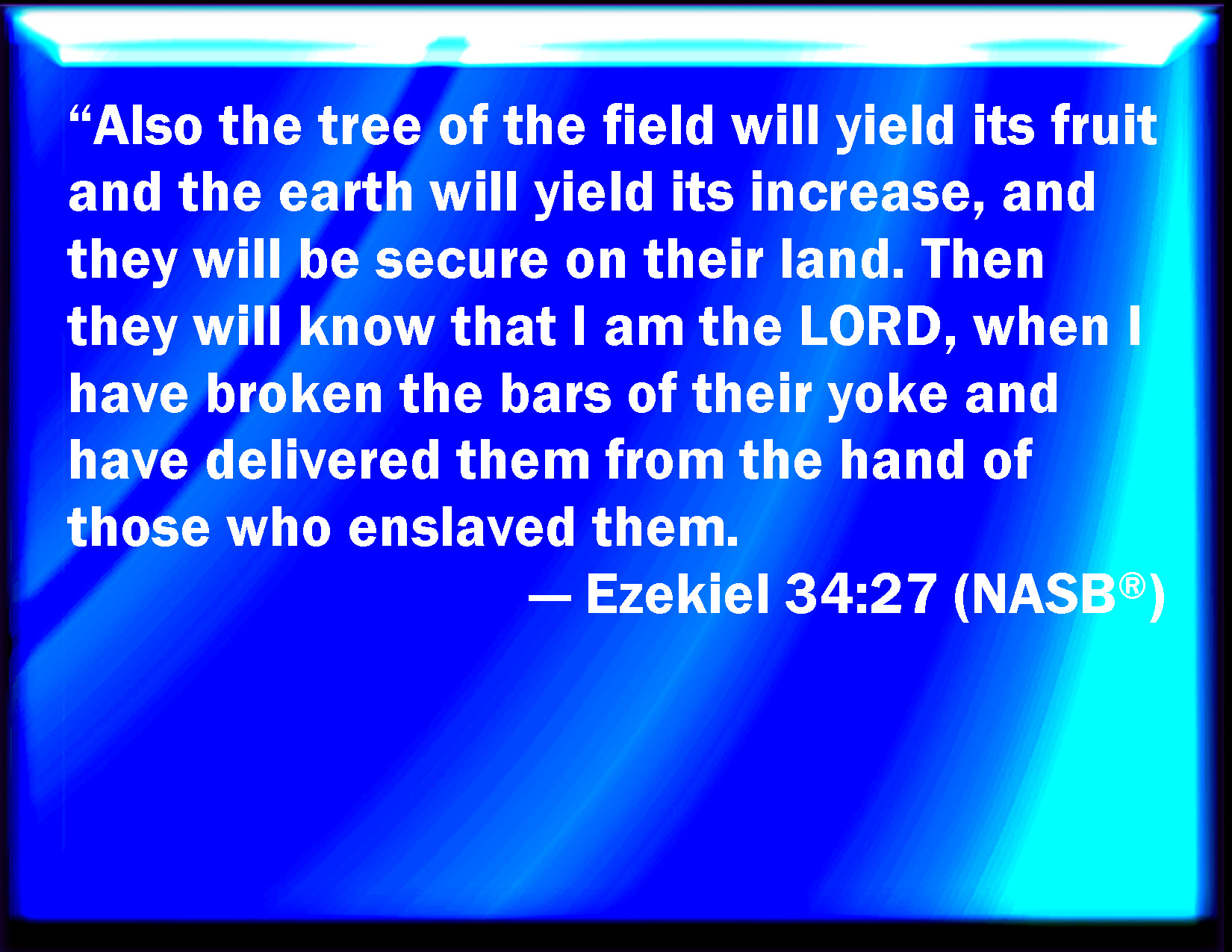 Bible Verse Slide Ezekiel 34:27 And the tree of the field shall yield her fruit, and the earth shall yield her increase, and they shall be safe in their land, and shall know that I am the LORD, when I have broken the bands of their yoke, and delivered them out of the hand of those that served themselves of them. KJV: And the tree of the field shall yield her fruit, and the earth shall yield her increase, and they shall be safe in their land, and shall know that I am the LORD, when I have broken the bands of their yoke, and delivered them out of the hand of those that served themselves of them. DRB: And the tree of the field shall yield its fruit, and the earth shall yield her increase, and they shall be in their land without fear: and they shall know that I am the Lord, when I shall have broken the bonds of their yoke, and shall have delivered them out of the hand of those that rule over them. DBT: And the tree of the field shall yield its fruit, and the earth shall yield its increase; and they shall be in safety in their land, and shall know that I am Jehovah, when I have broken the bands of their yoke and delivered them out of the hand of those that kept them in servitude. ERV: And the tree of the field shall yield its fruit, and the earth shall yield her increase, and they shall be secure in their land; and they shall know that I am the LORD, when I have broken the bars of their yoke, and have delivered them out of the hand of those that served themselves of them. WBT: And the tree of the field shall yield her fruit, and the earth shall yield her increase, and they shall be safe in their land, and shall know that I am the LORD, when I have broken the bands of their yoke, and delivered them out of the hand of those that subjected them to service. WEB: The tree of the field shall yield its fruit, and the earth shall yield its increase, and they shall be secure in their land; and they shall know that I am Yahweh, when I have broken the bars of their yoke, and have delivered them out of the hand of those who made slaves of them. YLT: And given hath the tree of the field its fruit, And the land doth give her increase, And they have been on their land confident, And they have known that I am Jehovah, In My breaking the bands of their yoke, And I have delivered them from the hand of those laying service on them.Links Ezekiel 34:27 NIV • Ezekiel 34:27 NLT • Ezekiel 34:27 ESV • Ezekiel 34:27 NASB • Ezekiel 34:27 KJV • Ezekiel 34:27 Interlinear • Ezekiel 34:27 Commentaries • Ezekiel 34:27 Parallel Texts • Ezekiel 34:27 Bible Apps • Ezekiel 34:27 Parallel • Bible Hub |