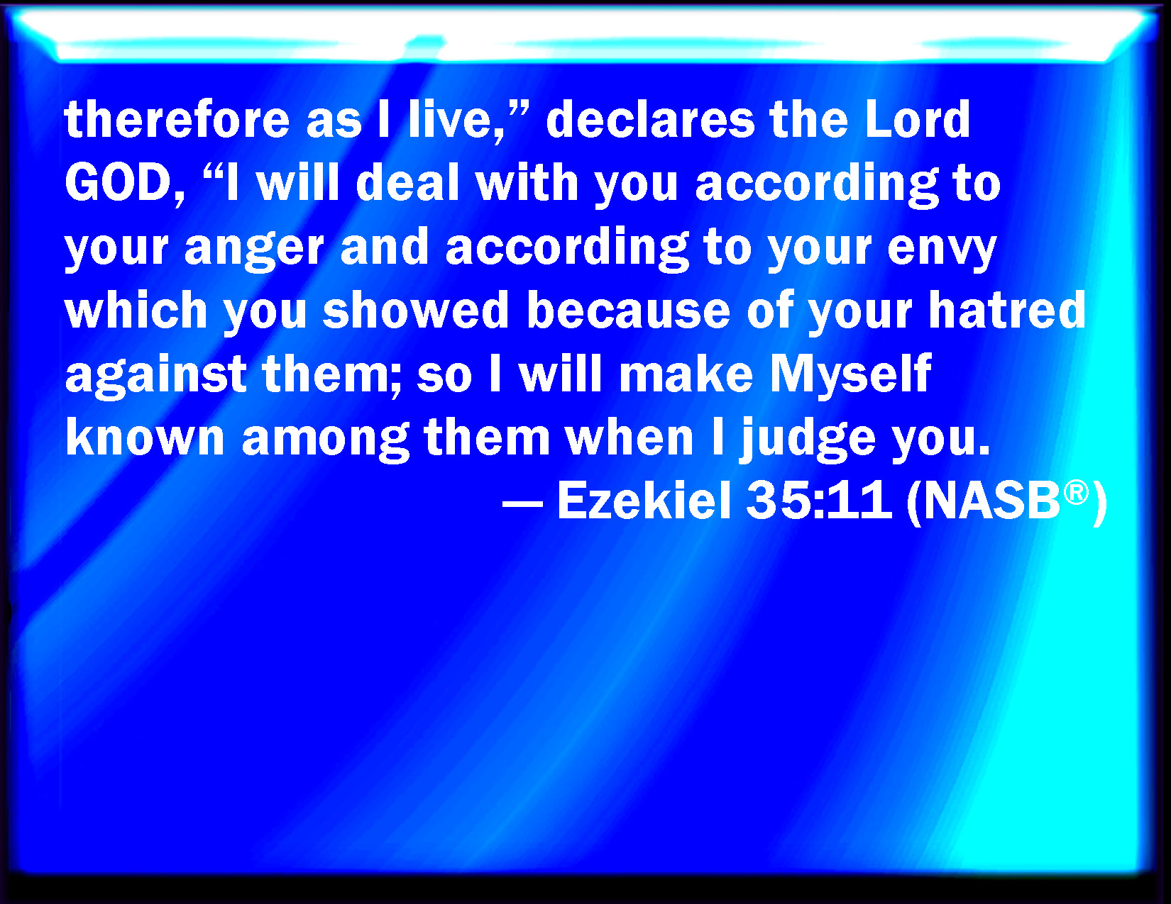 Bible Verse Slide Ezekiel 35:11 Therefore, as I live, said the Lord GOD, I will even do according to your anger, and according to your envy which you have used out of your hatred against them; and I will make myself known among them, when I have judged you. KJV: Therefore, as I live, saith the Lord GOD, I will even do according to thine anger, and according to thine envy which thou hast used out of thy hatred against them; and I will make myself known among them, when I have judged thee. DRB: Therefore as I live, saith the Lord God, I will do according to thy wrath, and according to thy envy, which thou hast exercised in hatred to them: and I will be made known by them, when I shall have judged thee. DBT: therefore, as I live, saith the Lord Jehovah, I will even do according to thine anger and according to thine envy, as thou hast done out of thy hatred against them; and I will make myself known among them, when I shall judge thee. ERV: therefore, as I live, saith the Lord GOD, I will do according to thine anger, and according to thine envy which thou hast shewed out of thy hatred against them; and I will make myself known among them, when I shall judge thee. WBT: Therefore, as I live, saith the Lord GOD, I will even do according to thy anger, and according to thy envy which thou hast used out of thy hatred against them; and I will make myself known among them, when I have judged thee. WEB: therefore, as I live, says the Lord Yahweh, I will do according to your anger, and according to your envy which you have shown out of your hatred against them; and I will make myself known among them, when I shall judge you. YLT: Therefore, I live — an affirmation of the Lord Jehovah, And I have done according to thine anger, And according to thine envy, With which thou hast wrought, Because of thy hatred against them, And I have been known among them when I judge thee.Links Ezekiel 35:11 NIV • Ezekiel 35:11 NLT • Ezekiel 35:11 ESV • Ezekiel 35:11 NASB • Ezekiel 35:11 KJV • Ezekiel 35:11 Interlinear • Ezekiel 35:11 Commentaries • Ezekiel 35:11 Parallel Texts • Ezekiel 35:11 Bible Apps • Ezekiel 35:11 Parallel • Bible Hub |