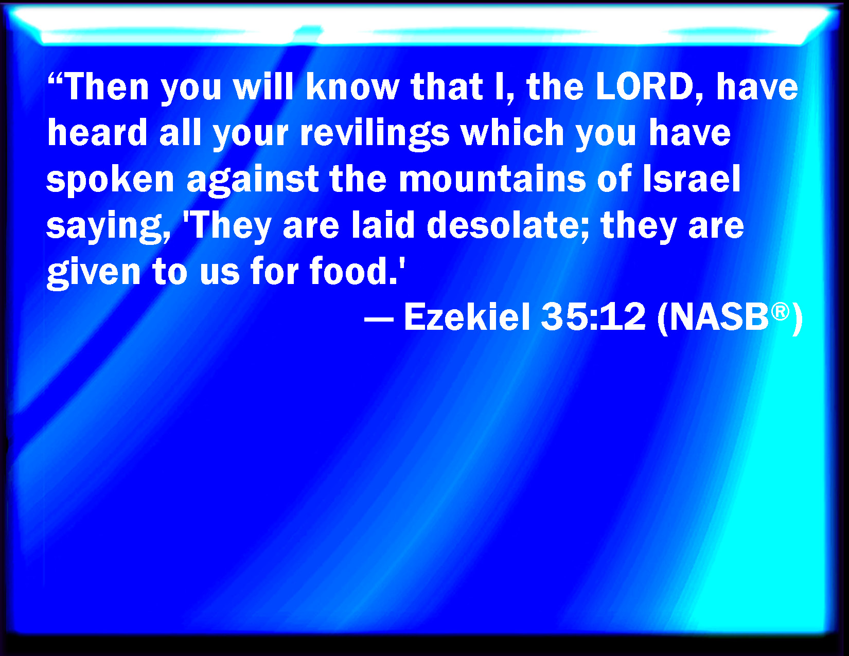 Bible Verse Slide Ezekiel 35:12 And you shall know that I am the LORD, and that I have heard all your blasphemies which you have spoken against the mountains of Israel, saying, They are laid desolate, they are given us to consume. KJV: And thou shalt know that I am the LORD, and that I have heard all thy blasphemies which thou hast spoken against the mountains of Israel, saying, They are laid desolate, they are given us to consume. DRB: And thou shalt know that I the Lord have heard all thy reproaches, that thou hast spoken against the mountains of Israel, saying: They are desolate, they are given to us to consume. DBT: And thou shalt know that I Jehovah have heard all thy reproaches, which thou hast uttered against the mountains of Israel, saying, They are laid desolate, they are given us to devour. ERV: And thou shalt know that I the LORD have heard all thy blasphemies which thou hast spoken against the mountains of Israel, saying, They are laid desolate, they are given us to devour. WBT: And thou shalt know that I am the LORD, and that I have heard all thy blasphemies which thou hast spoken against the mountains of Israel, saying, They are laid desolate, they are given us to consume. WEB: You shall know that I, Yahweh, have heard all your insults which you have spoken against the mountains of Israel, saying, They are laid desolate, they have been given us to devour. YLT: And thou hast known that I — Jehovah, I have heard all thy despisings that thou hast spoken Against mountains of Israel, saying: A desolation, to us they were given for food.Links Ezekiel 35:12 NIV • Ezekiel 35:12 NLT • Ezekiel 35:12 ESV • Ezekiel 35:12 NASB • Ezekiel 35:12 KJV • Ezekiel 35:12 Interlinear • Ezekiel 35:12 Commentaries • Ezekiel 35:12 Parallel Texts • Ezekiel 35:12 Bible Apps • Ezekiel 35:12 Parallel • Bible Hub |