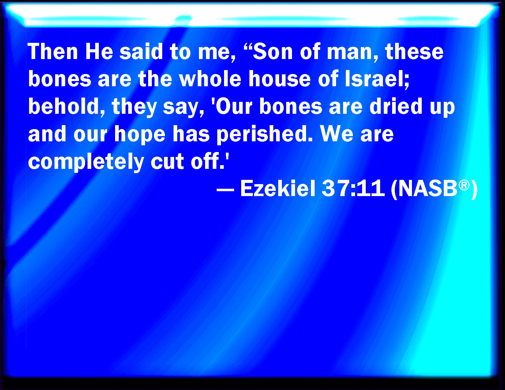 Bible Verse Slide Ezekiel 37:11 Then he said to me, Son of man, these bones are the whole house of Israel: behold, they say, Our bones are dried, and our hope is lost: we are cut off for our parts. KJV: Then he said unto me, Son of man, these bones are the whole house of Israel: behold, they say, Our bones are dried, and our hope is lost: we are cut off for our parts. DRB: And he said to me: Son of man: All these bones are the house of Israel : they say: Our bones are dried up, and our hope is lost, and we are cut off. DBT: And he said unto me, Son of man, these bones are the whole house of Israel. Behold, they say, Our bones are dried, and our hope is lost: we are cut off! ERV: Then he said unto me, Son of man, these bones are the whole house of Israel: behold, they say, Our bones are dried up, and our hope is lost; we are clean cut off. WBT: Then he said to me, Son of man, these bones are the whole house of Israel: behold, they say, Our bones are dried, and our hope is lost: we are cut off for our parts. WEB: Then he said to me, Son of man, these bones are the whole house of Israel: behold, they say, Our bones are dried up, and our hope is lost; we are clean cut off. YLT: And He saith unto me, 'Son of man, these bones are the whole house of Israel; lo, they are saying: Dried up have our bones, And perished hath our hope, We have been cut off by ourselves.Links Ezekiel 37:11 NIV • Ezekiel 37:11 NLT • Ezekiel 37:11 ESV • Ezekiel 37:11 NASB • Ezekiel 37:11 KJV • Ezekiel 37:11 Interlinear • Ezekiel 37:11 Commentaries • Ezekiel 37:11 Parallel Texts • Ezekiel 37:11 Bible Apps • Ezekiel 37:11 Parallel • Bible Hub |