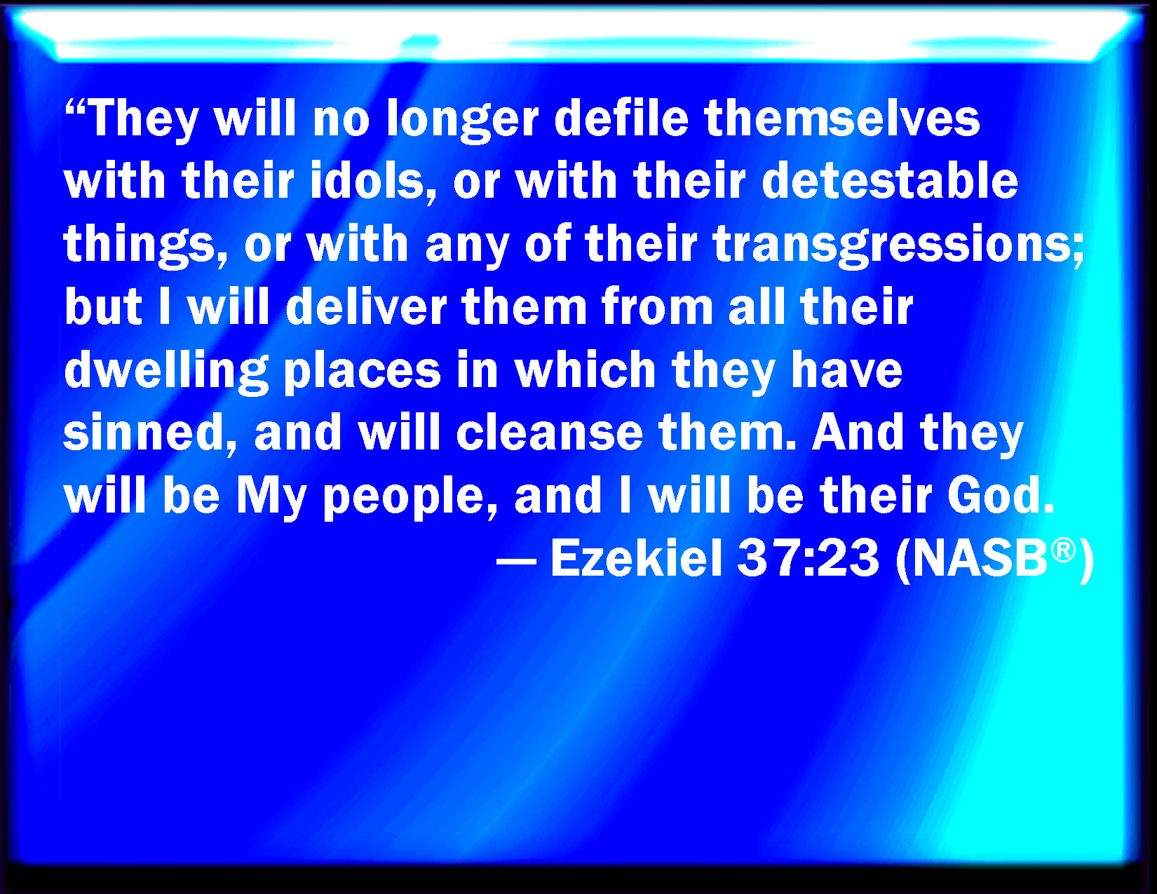 Bible Verse Slide Ezekiel 37:23 Neither shall they defile themselves any more with their idols, nor with their detestable things, nor with any of their transgressions: but I will save them out of all their dwelling places, wherein they have sinned, and will cleanse them: so shall they be my people, and I will be their God. KJV: Neither shall they defile themselves any more with their idols, nor with their detestable things, nor with any of their transgressions: but I will save them out of all their dwellingplaces, wherein they have sinned, and will cleanse them: so shall they be my people, and I will be their God. DRB: Nor shall they be defiled any more with their idols, nor with their abominations, nor with all their iniquities: and I will save them out of all the places in which they have sinned, and I will cleanse them: and they shall be my people, and I will be their God. DBT: And they shall not defile themselves any more with their idols, or with their detestable things, or with any of their transgressions; and I will save them out of all their dwelling-places wherein they have sinned, and will cleanse them; and they shall be my people, and I will be their God. ERV: neither shall they defile themselves any more with their idols, nor with their detestable things, nor with any of their transgressions: but I will save them out of all their dwelling places, wherein they have sinned, and will cleanse them: so shall they be my people, and I will be their God. WBT: Neither shall they defile themselves any more with their idols, nor with their detestable things, nor with any of their transgressions: but I will save them out of all their dwelling-places, in which they have sinned, and will cleanse them: so shall they be my people, and I will be their God. WEB: neither shall they defile themselves any more with their idols, nor with their detestable things, nor with any of their transgressions; but I will save them out of all their dwelling places, in which they have sinned, and will cleanse them: so shall they be my people, and I will be their God. YLT: Nor are they defiled any more with their idols, And with their abominations, And with any of their transgressions, And I have saved them out of all their dwellings, In which they have sinned, And I have cleansed them, And they have been to Me for a people, And I — I am to them for God.Links Ezekiel 37:23 NIV • Ezekiel 37:23 NLT • Ezekiel 37:23 ESV • Ezekiel 37:23 NASB • Ezekiel 37:23 KJV • Ezekiel 37:23 Interlinear • Ezekiel 37:23 Commentaries • Ezekiel 37:23 Parallel Texts • Ezekiel 37:23 Bible Apps • Ezekiel 37:23 Parallel • Bible Hub |