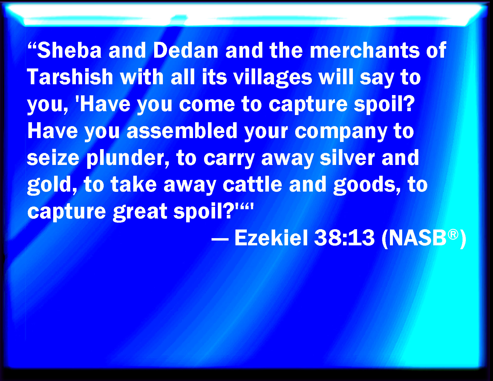 Bible Verse Slide Ezekiel 38:13 Sheba, and Dedan, and the merchants of Tarshish, with all the young lions thereof, shall say to you, Are you come to take a spoil? have you gathered your company to take a prey? to carry away silver and gold, to take away cattle and goods, to take a great spoil? KJV: Sheba, and Dedan, and the merchants of Tarshish, with all the young lions thereof, shall say unto thee, Art thou come to take a spoil? hast thou gathered thy company to take a prey? to carry away silver and gold, to take away cattle and goods, to take a great spoil? DRB: Saba, and Dedan, and the merchants of Tharsis, and all the lions thereof shall say to thee: Art thou come to take spoils? behold, thou hast gathered thy multitude to take a prey, to take silver, and gold, and to carry away goods and substance, and to take rich spoils. DBT: Sheba, and Dedan, and the merchants of Tarshish, with all the young lions thereof, shall say unto thee, Art thou come to seize a spoil? hast thou gathered thine assemblage to take a prey? to carry away silver and gold, to take cattle and goods, to seize a great spoil? ERV: Sheba, and Dedan, and the merchants of Tarshish; with all the young lions thereof, shall say unto thee, Art thou come to take the spoil? hast thou assembled thy company to take the prey? to carry away silver and gold, to take away cattle and goods, to take great spoil? WBT: Sheba, and Dedan, and the merchants of Tarshish, with all its young lions, shall say to thee, Art thou come to take a spoil? hast thou gathered thy company to take a prey? to carry away silver and gold, to take away cattle and goods, to take a great spoil? WEB: Sheba, and Dedan, and the merchants of Tarshish, with all the young lions of it, shall tell you, Have you come to take the spoil? have you assembled your company to take the prey? to carry away silver and gold, to take away livestock and goods, to take great spoil? YLT: Sheba, and Dedan, and merchants of Tarshish, And all its young lions say to thee: To take a spoil art thou come in? To take a prey assembled thine assembly? To bear away silver and gold? To take away cattle and substance? To take a great spoil?Links Ezekiel 38:13 NIV • Ezekiel 38:13 NLT • Ezekiel 38:13 ESV • Ezekiel 38:13 NASB • Ezekiel 38:13 KJV • Ezekiel 38:13 Interlinear • Ezekiel 38:13 Commentaries • Ezekiel 38:13 Parallel Texts • Ezekiel 38:13 Bible Apps • Ezekiel 38:13 Parallel • Bible Hub |