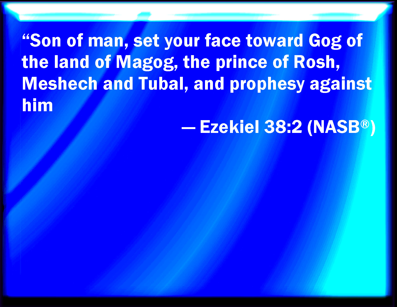Bible Verse Slide Ezekiel 38:2 Son of man, set your face against Gog, the land of Magog, the chief prince of Meshech and Tubal, and prophesy against him, KJV: Son of man, set thy face against Gog, the land of Magog, the chief prince of Meshech and Tubal, and prophesy against him, DRB: Son of man, set thy face against Gog, the land of Magog, the chief prince of Mosoch and Thubal: and prophesy of him, DBT: Son of man, set thy face against Gog, the land of Magog, the prince of Rosh, Meshech, and Tubal, and prophesy against him, ERV: Son of man, set thy face toward Gog, of the land of Magog, the prince of Rosh, Meshech, and Tubal, and prophesy against him, WBT: Son of man, set thy face against Gog, the land of Magog, the chief prince of Meshech and Tubal, and prophesy against him. WEB: Son of man, set your face toward Gog, of the land of Magog, the prince of Rosh, Meshech, and Tubal, and prophesy against him, YLT: 'Son of man, set thy face unto Gog, of the land of Magog, prince of Rosh, Meshech, and Tubal, and prophesy concerning him,Links Ezekiel 38:2 NIV • Ezekiel 38:2 NLT • Ezekiel 38:2 ESV • Ezekiel 38:2 NASB • Ezekiel 38:2 KJV • Ezekiel 38:2 Interlinear • Ezekiel 38:2 Commentaries • Ezekiel 38:2 Parallel Texts • Ezekiel 38:2 Bible Apps • Ezekiel 38:2 Parallel • Bible Hub |
