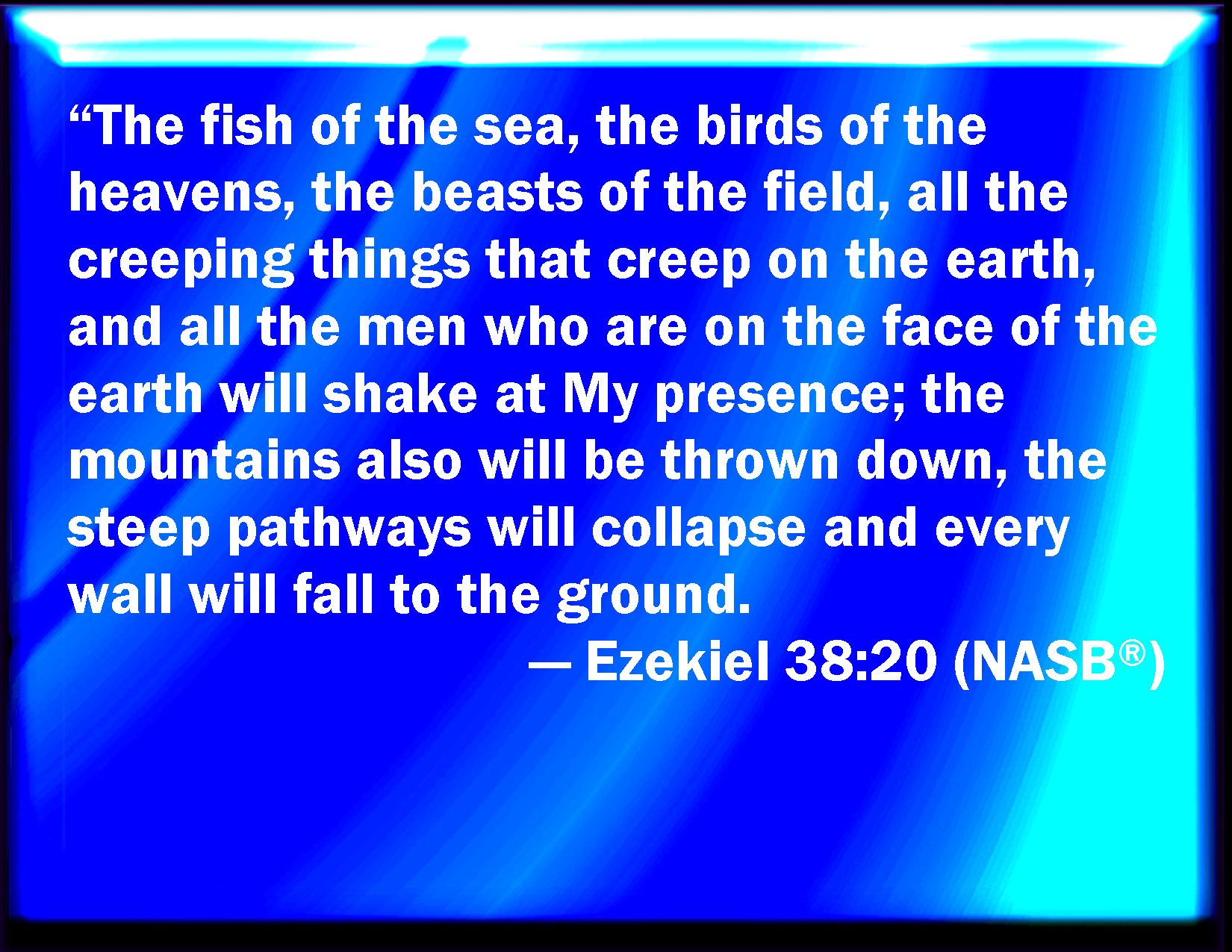 Bible Verse Slide Ezekiel 38:20 So that the fishes of the sea, and the fowls of the heaven, and the beasts of the field, and all creeping things that creep on the earth, and all the men that are on the face of the earth, shall shake at my presence, and the mountains shall be thrown down, and the steep places shall fall, and every wall shall fall to the ground. KJV: So that the fishes of the sea, and the fowls of the heaven, and the beasts of the field, and all creeping things that creep upon the earth, and all the men that are upon the face of the earth, shall shake at my presence, and the mountains shall be thrown down, and the steep places shall fall, and every wall shall fall to the ground. DRB: So that the fishes of the sea, and the birds of the air, and the beasts of the field, and every creeping thing that creepeth upon the ground, and all men that are upon the face of the earth, shall be moved at my presence: and the mountains shall be thrown down, and the hedges shall fall, and every wall shall fall to the ground. DBT: so that the fish of the sea, and the fowl of the heavens, and the beasts of the field, and all creeping things which creep upon the earth, and all mankind that are upon the face of the earth shall shake at my presence; and the mountains shall be thrown down, and the steep places shall fall, and every wall shall fall to the ground. ERV: so that the fishes of the sea, and the fowls of the heaven, and the beasts of the field, and all creeping things that creep upon the earth, and all the men that are upon the face of the earth, shall shake at my presence, and the mountains shall be thrown down, and the steep places shall fall, and every wall shall fall to the ground. WBT: So that the fishes of the sea, and the fowls of the heaven, and the beasts of the field, and all creeping animals that creep upon the earth, and all the men that are upon the face of the earth, shall shake at my presence, and the mountains shall be overturned, and the steep places shall fall, and every wall shall fall to the ground. WEB: so that the fish of the sea, and the birds of the sky, and the animals of the field, and all creeping things who creep on the earth, and all the men who are on the surface of the earth, shall shake at my presence, and the mountains shall be thrown down, and the steep places shall fall, and every wall shall fall to the ground. YLT: And rushed from My presence have fishes of the sea, And the fowl of the heavens, And the beast of the field, And every creeping thing that is creeping on the ground, And all men who are on the face of the ground, And thrown down have been the mountains, And fallen have the ascents, And every wall to the earth falleth.Links Ezekiel 38:20 NIV • Ezekiel 38:20 NLT • Ezekiel 38:20 ESV • Ezekiel 38:20 NASB • Ezekiel 38:20 KJV • Ezekiel 38:20 Interlinear • Ezekiel 38:20 Commentaries • Ezekiel 38:20 Parallel Texts • Ezekiel 38:20 Bible Apps • Ezekiel 38:20 Parallel • Bible Hub |
