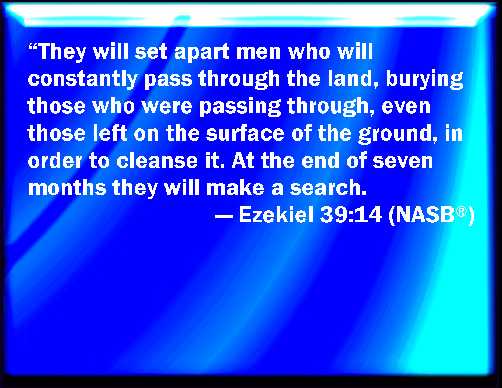 Bible Verse Slide Ezekiel 39:14 And they shall sever out men of continual employment, passing through the land to bury with the passengers those that remain on the face of the earth, to cleanse it: after the end of seven months shall they search. KJV: And they shall sever out men of continual employment, passing through the land to bury with the passengers those that remain upon the face of the earth, to cleanse it: after the end of seven months shall they search. DRB: And they shall appoint men to go continually about the land, to bury and to seek out them that were remaining upon the face of the earth, that they may cleanse it: and after seven months they shall begin to seek. DBT: And they shall sever out men of continual employment to go through the land, who, with the passers-by, shall bury those that remain upon the face of the land, to cleanse it: at the end of seven months shall they make a search. ERV: And they shall sever out men of continual employment, that shall pass through the land to bury them that pass through, that remain upon the face of the land, to cleanse it: after the end of seven months shall they search. WBT: And they shall sever out men of continual employment, passing through the land to bury with the passengers those that remain upon the face of the earth, to cleanse it: after the end of seven months shall they search. WEB: They shall set apart men of continual employment, who shall pass through the land, and, with those who pass through, those who bury those who remain on the surface of the land, to cleanse it: after the end of seven months shall they search. YLT: And men for continual employment they separate, passing on through the land, burying with those passing by those who are left on the face of the earth, to cleanse it: at the end of seven months they search.Links Ezekiel 39:14 NIV • Ezekiel 39:14 NLT • Ezekiel 39:14 ESV • Ezekiel 39:14 NASB • Ezekiel 39:14 KJV • Ezekiel 39:14 Interlinear • Ezekiel 39:14 Commentaries • Ezekiel 39:14 Parallel Texts • Ezekiel 39:14 Bible Apps • Ezekiel 39:14 Parallel • Bible Hub |
