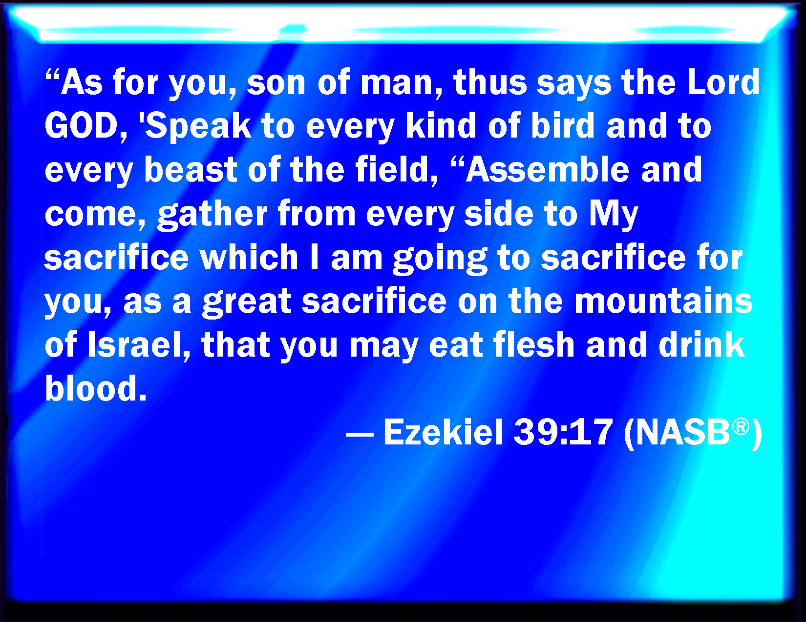 Bible Verse Slide Ezekiel 39:17 And, you son of man, thus said the Lord GOD; Speak to every feathered fowl, and to every beast of the field, Assemble yourselves, and come; gather yourselves on every side to my sacrifice that I do sacrifice for you, even a great sacrifice on the mountains of Israel, that you may eat flesh, and drink blood. KJV: And, thou son of man, thus saith the Lord GOD; Speak unto every feathered fowl, and to every beast of the field, Assemble yourselves, and come; gather yourselves on every side to my sacrifice that I do sacrifice for you, even a great sacrifice upon the mountains of Israel, that ye may eat flesh, and drink blood. DRB: And thou, O son of man, saith the Lord God, say to every fowl, and to all the birds, and to all the beasts of the field: Assemble yourselves, make haste, come together from every side to my victim, which I slay for you, a great victim upon the mountains of Israel: to eat flesh, and drink blood. DBT: And thou, son of man, thus saith the Lord Jehovah: Speak unto the birds of every wing, and to every beast of the field, Gather yourselves together and come, assemble yourselves on every side to my sacrifice which I sacrifice for you, a great sacrifice upon the mountains of Israel, that ye may eat flesh, and drink blood. ERV: And thou, son of man, thus saith the Lord GOD: Speak unto the birds of every sort, and to every beast of the field, Assemble yourselves, and come; gather yourselves on every side to my sacrifice that I do sacrifice for you, even a great sacrifice upon the mountains of Israel, that ye may eat flesh and drink blood. WBT: And, thou son of man, thus saith the Lord GOD; Speak to every feathered fowl, and to every beast of the field, Assemble yourselves, and come; gather yourselves on every side to my sacrifice that I do sacrifice for you, even a great sacrifice upon the mountains of Israel, that ye may eat flesh, and drink blood. WEB: You, son of man, thus says the Lord Yahweh: Speak to the birds of every sort, and to every animal of the field, Assemble yourselves, and come; gather yourselves on every side to my sacrifice that I do sacrifice for you, even a great sacrifice on the mountains of Israel, that you may eat flesh and drink blood. YLT: And thou, son of man, thus said the Lord Jehovah: Say to the bird — every wing, and to every beast of the field: Be assembled and come in, Be gathered from round about, For My sacrifice that I am sacrificing for you, A great sacrifice on mountains of Israel, And ye have eaten flesh, and drunk blood.Links Ezekiel 39:17 NIV • Ezekiel 39:17 NLT • Ezekiel 39:17 ESV • Ezekiel 39:17 NASB • Ezekiel 39:17 KJV • Ezekiel 39:17 Interlinear • Ezekiel 39:17 Commentaries • Ezekiel 39:17 Parallel Texts • Ezekiel 39:17 Bible Apps • Ezekiel 39:17 Parallel • Bible Hub |