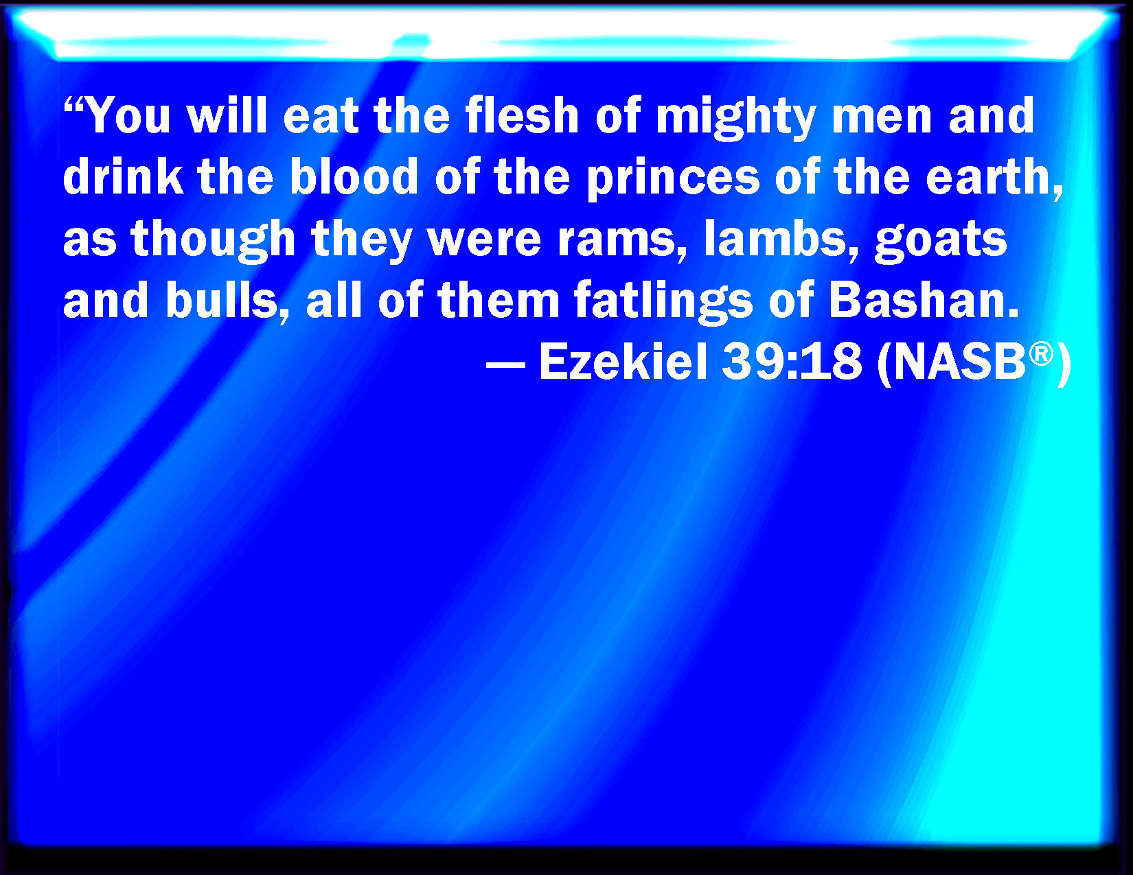 Bible Verse Slide Ezekiel 39:18 You shall eat the flesh of the mighty, and drink the blood of the princes of the earth, of rams, of lambs, and of goats, of bullocks, all of them fatted calves of Bashan. KJV: Ye shall eat the flesh of the mighty, and drink the blood of the princes of the earth, of rams, of lambs, and of goats, of bullocks, all of them fatlings of Bashan. DRB: You shall eat the flesh of the mighty, and you shall drink the blood of the princes of the earth, of rams, and of lambs, and of he goats, and bullocks, and of all that are well fed and fat. DBT: Ye shall eat the flesh of the mighty, and drink the blood of the princes of the earth, of rams, of lambs, and of goats, and of bullocks, all of them fatted beasts of Bashan. ERV: Ye shall eat the flesh of the mighty, and drink the blood of the princes of the earth, of rams, of lambs, and of goats, of bullocks, all of them fatlings of Bashan. WBT: Ye shall eat the flesh of the mighty, and drink the blood of the princes of the earth, of rams, of lambs, and of goats, of bullocks, all of them fatlings of Bashan. WEB: You shall eat the flesh of the mighty, and drink the blood of the princes of the earth, of rams, of lambs, and of goats, of bulls, all of them fatlings of Bashan. YLT: Flesh of the mighty ye do eat, And blood of princes of the earth ye drink, Of rams, of lambs, and of he-goats, Of calves, fatlings of Bashan — all of them.Links Ezekiel 39:18 NIV • Ezekiel 39:18 NLT • Ezekiel 39:18 ESV • Ezekiel 39:18 NASB • Ezekiel 39:18 KJV • Ezekiel 39:18 Interlinear • Ezekiel 39:18 Commentaries • Ezekiel 39:18 Parallel Texts • Ezekiel 39:18 Bible Apps • Ezekiel 39:18 Parallel • Bible Hub |