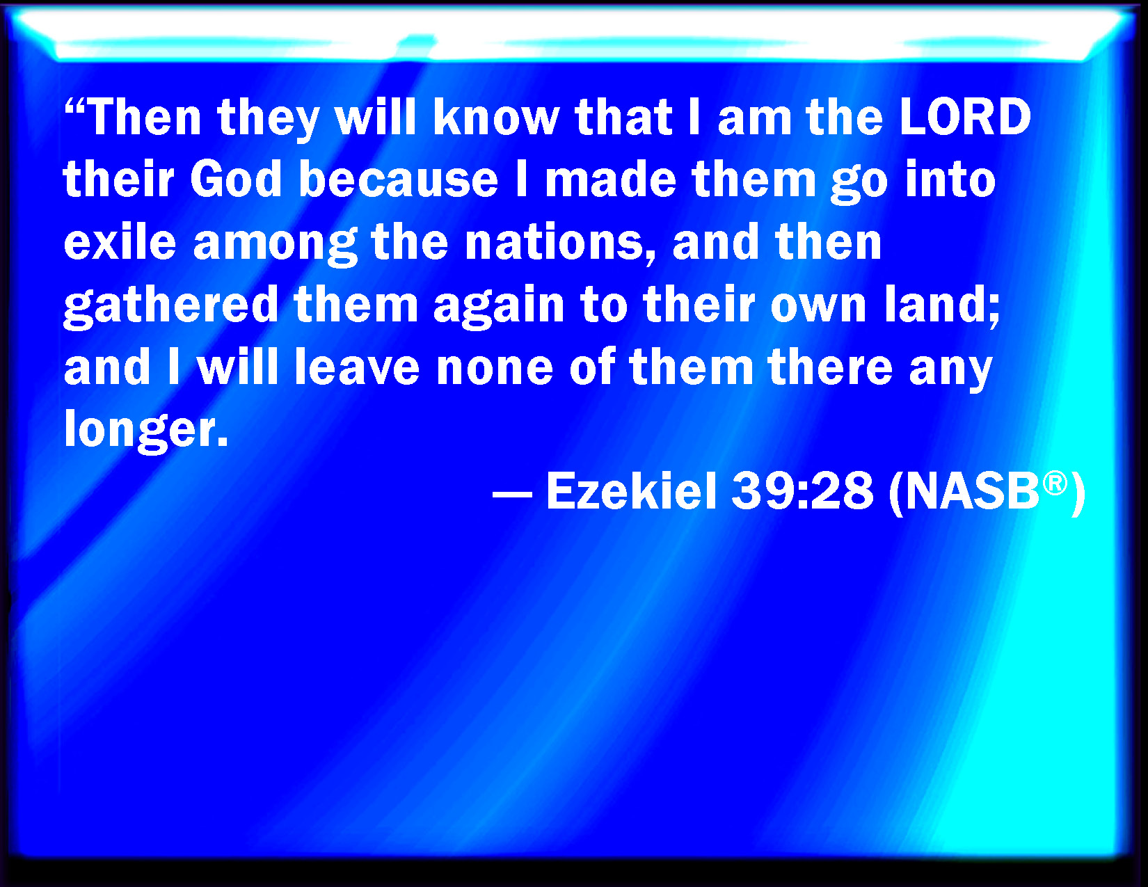 Bible Verse Slide Ezekiel 39:28 Then shall they know that I am the LORD their God, which caused them to be led into captivity among the heathen: but I have gathered them to their own land, and have left none of them any more there. KJV: Then shall they know that I am the LORD their God, which caused them to be led into captivity among the heathen: but I have gathered them unto their own land, and have left none of them any more there. DRB: And they shall know that I am the Lord their God, because I caused them to be carried away among the nations; and I have gathered them together unto their own land, and have not left any of them there. DBT: And they shall know that I am Jehovah their God, in that I caused them to be led into captivity among the nations, and have gathered them unto their own land, and have left none of them any more there. ERV: And they shall know that I am the LORD their God, in that I caused them to go into captivity among the nations, and have gathered them unto their own land; and I will leave none of them any more there; WBT: Then shall they know that I am the LORD their God, who caused them to be led into captivity among the heathen: but I have gathered them to their own land, and have left none of them there any more. WEB: They shall know that I am Yahweh their God, in that I caused them to go into captivity among the nations, and have gathered them to their own land; and I will leave none of them any more there; YLT: And they have known that I am Jehovah their God, In My removing them unto the nations, And I have gathered them unto their land, And I leave none of them any more there.Links Ezekiel 39:28 NIV • Ezekiel 39:28 NLT • Ezekiel 39:28 ESV • Ezekiel 39:28 NASB • Ezekiel 39:28 KJV • Ezekiel 39:28 Interlinear • Ezekiel 39:28 Commentaries • Ezekiel 39:28 Parallel Texts • Ezekiel 39:28 Bible Apps • Ezekiel 39:28 Parallel • Bible Hub |